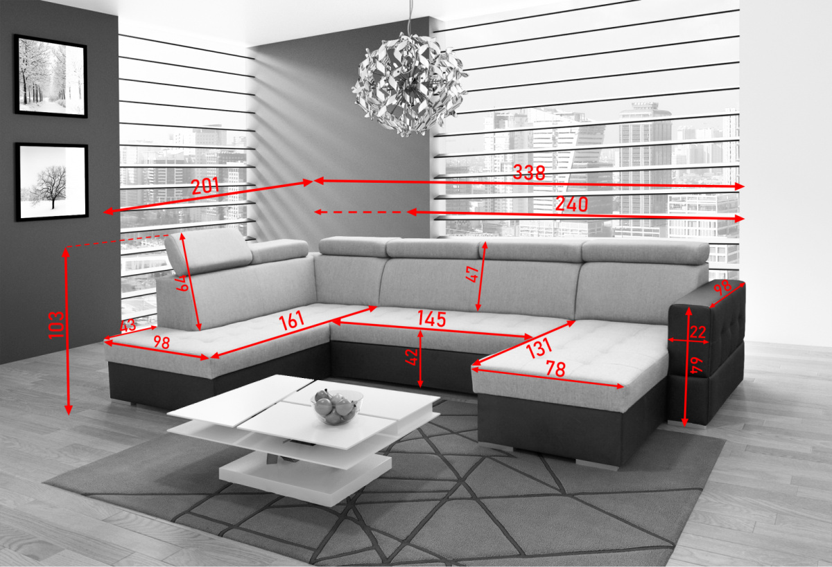 Celkové rozměry: 175x335x201 cm/v. 87-101 cm