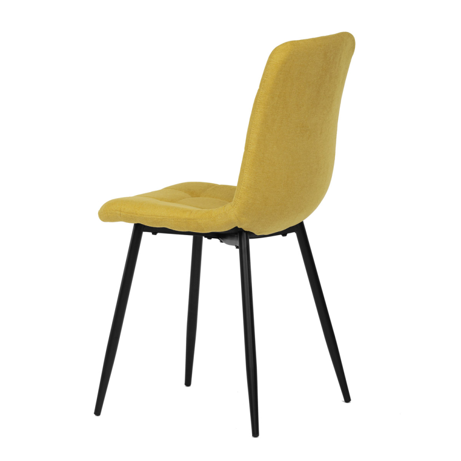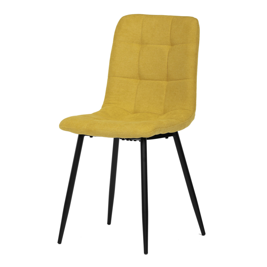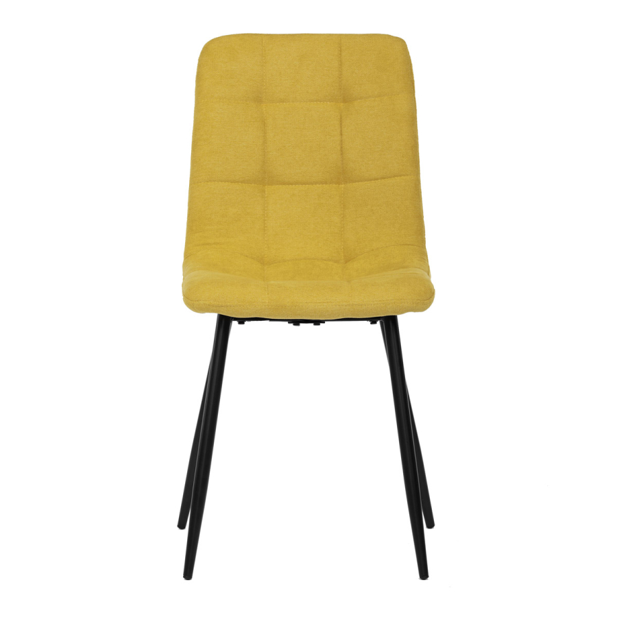 Jídelní minimalistická židle v industriálním stylu. Potah je z jemně hrubé látky ve velmi žádaném hořčicově žlutím odstínu. Velmi dekorativní a výrazné je čtvercové prošívání čelních ploch sedáku i opěradla s čalounickými vtahy. Polstrování je z kvalitní PU pěny. Stabilitu židle zajišťují čtyři kónické kovové nohy s kvalitním práškovým nástřikem v černé matné barvě. Ukončené jsou černými plastovými kluzáky, zabraňující poškození tvrdých povrchů podlah. Nohy jsou kruhového průřezu o nejvyšším průměru 2,5 cm.
