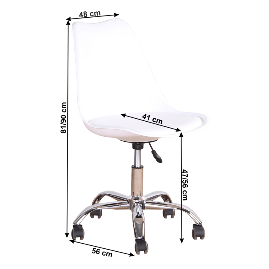 Materiál: plast/ekokůže/chrom, oděruodolnost textilie podle testu Martindale: 100 000 oděrek, barva: bílá/chromovaná, rozměry (ŠxHxV): 48x56x81-90 cm, nastavitelná výška sedu, výška sedu: 47-56 cm, hloubka sedu: 41cm, nosnost: 100 kg. Dodávané v demontu.