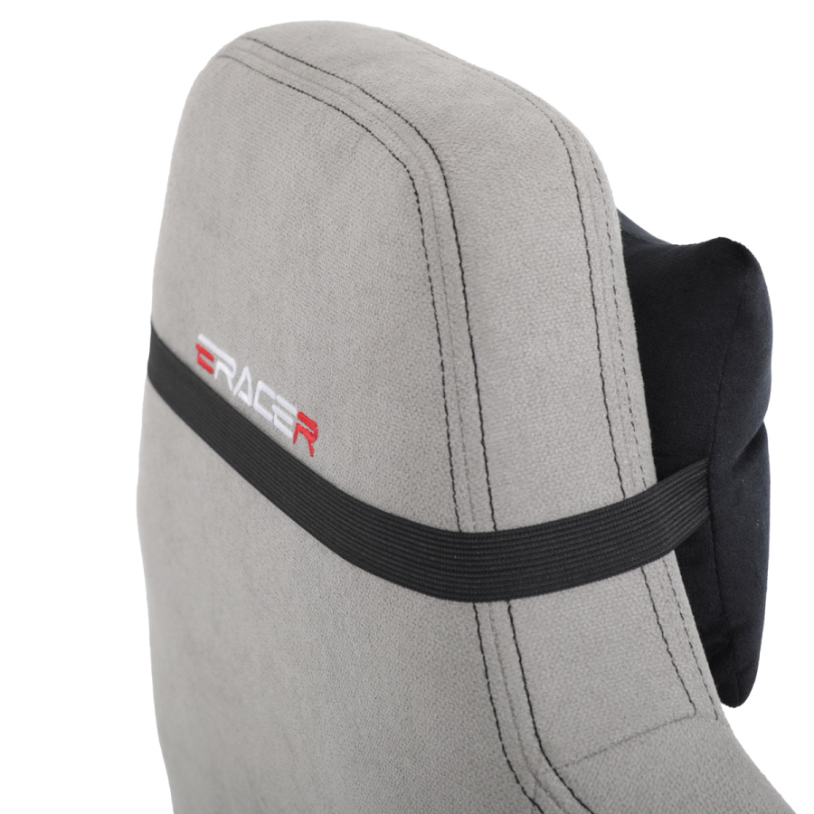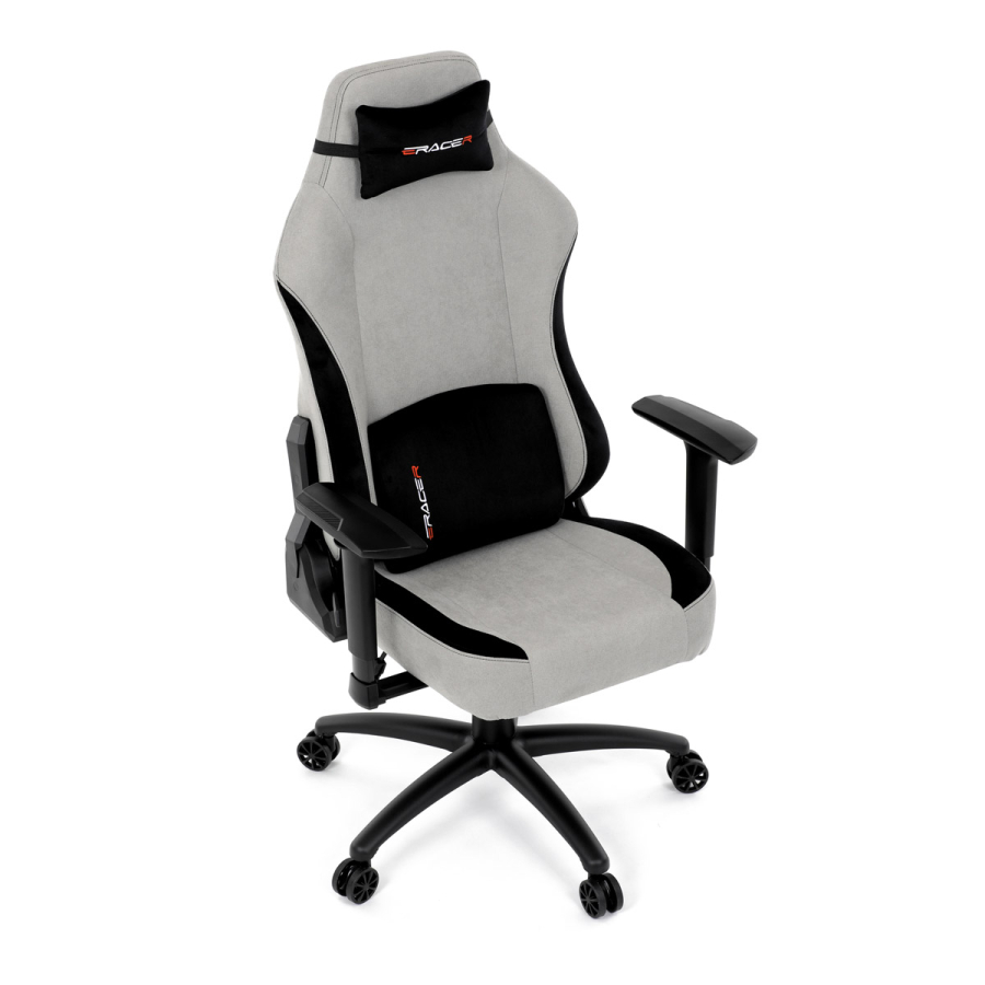 Herní křeslo, stříbrná látka, houpací mechanismus, polohování opěradla 90°-180°, 3D područky, polštáře z paměťové pěny