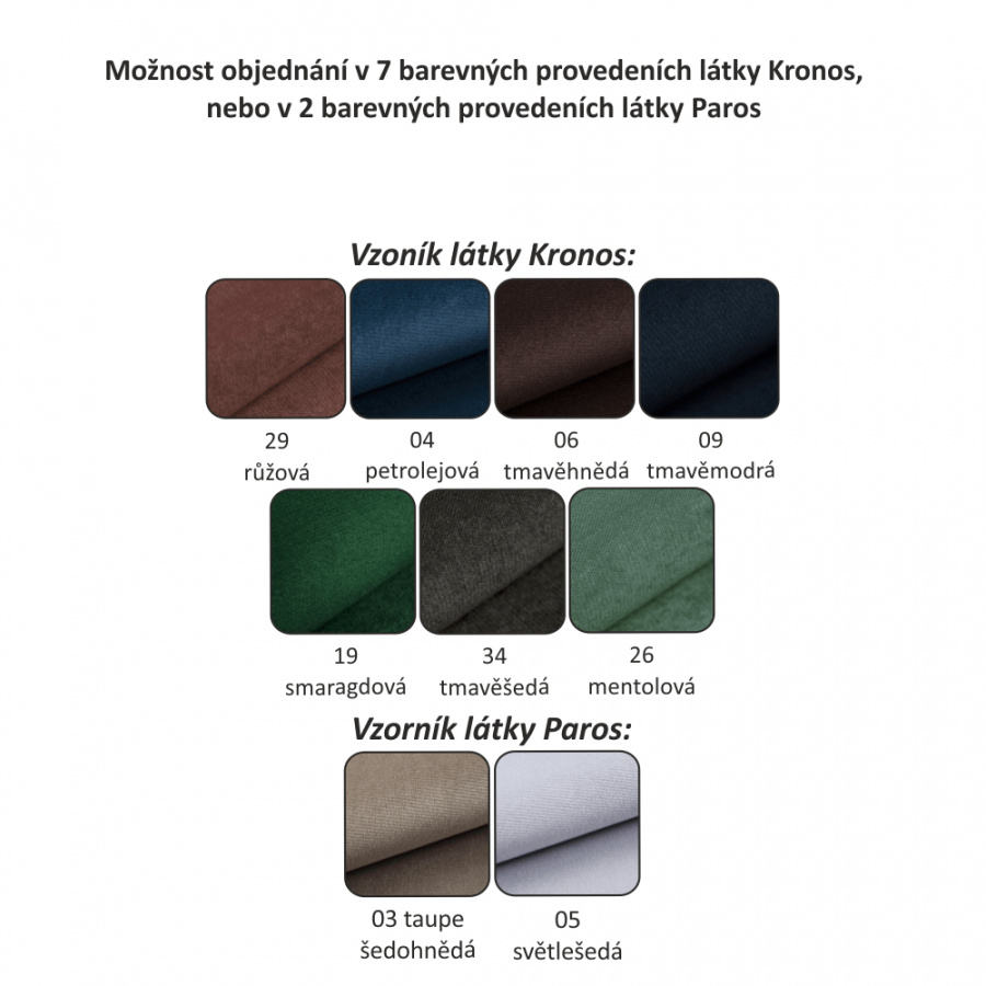 Možnost objednání v 7 barevných provedeních látky Kronos a ve 2 barevných provedeních látky Paros. Upozorňujeme, že při objednávkách na nábytek v jiném barevném provedení, jak máme běžně skladem, neumíme zaručit doručení do Vánoc. Totéž platí i při nábytku označeném na objednávku. Doba dodání 14-17 týdnů.