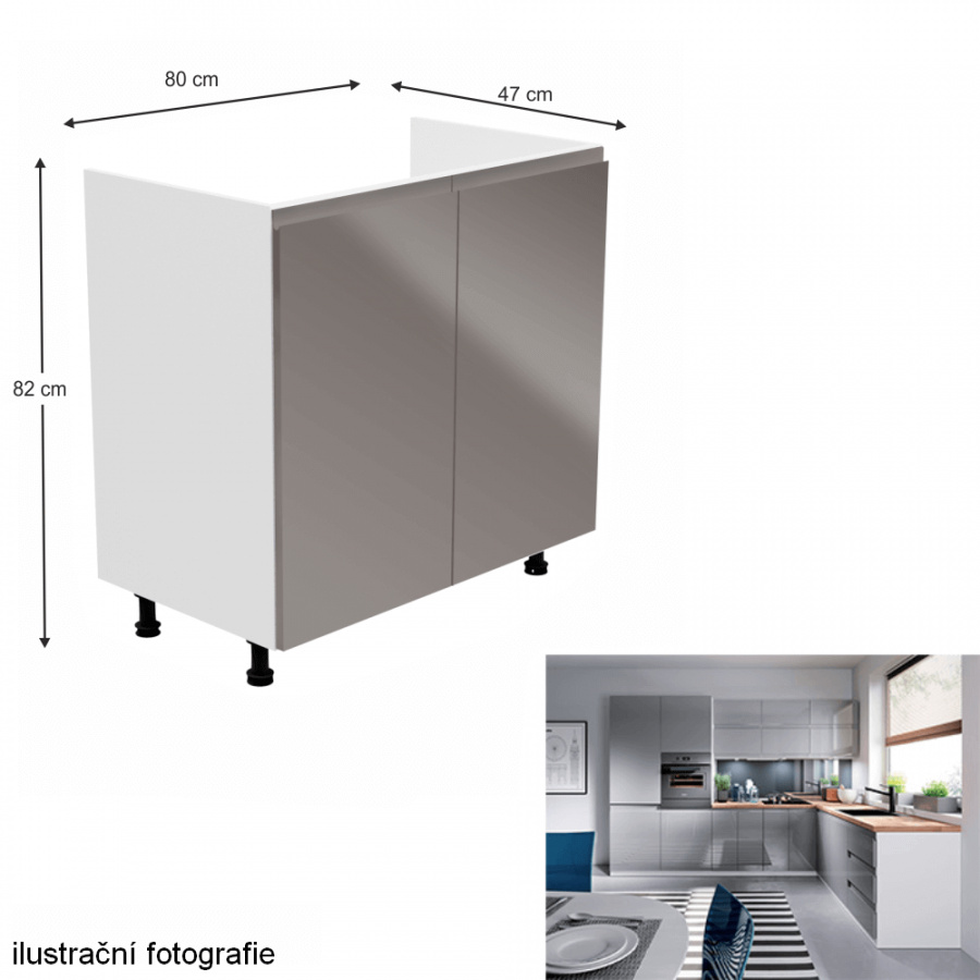 Dřezová skříňka, Aurora D80Z Provedení: DTD laminové / MDF Barva: bílá / šedá extra vysoký lesk Rozměry (ŠxHxV): 80x47x82 cm Tloušťka materiálu: 15 mm Je nutné objednat potřebný počet ukončení spodní lišty Pracovní deska není součástí skříněk. Je možné si doobjednat pracovní desku v provedení dub lefkas tmavý tloušťky 38 mm za 1.240 Kč / bm. Možnost dokoupit dřez se cenu 1990 Kč. Ke každé dolní skříňce, kromě D25PZ, je třeba doobjednat 2ks úchytů na sokel- cena 20 Kč. Spodní skříňky jsou dodávány včetně dolní lišty, avšak přesný rozměr, který potřebujete, je třeba uvést do poznámky v objednávce. Pokud rozměr neuvedete, může se stát, že vám sokl nebude dodán.