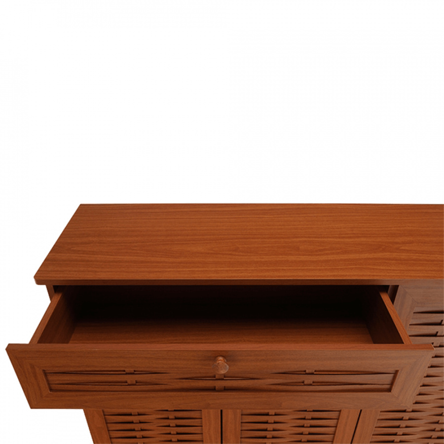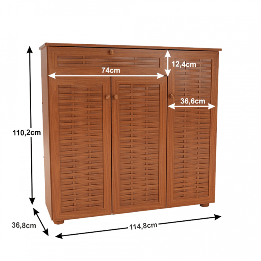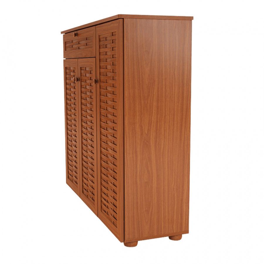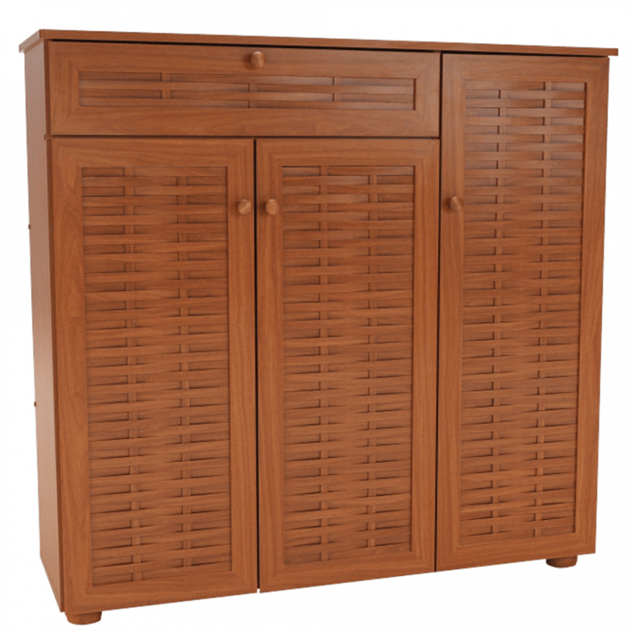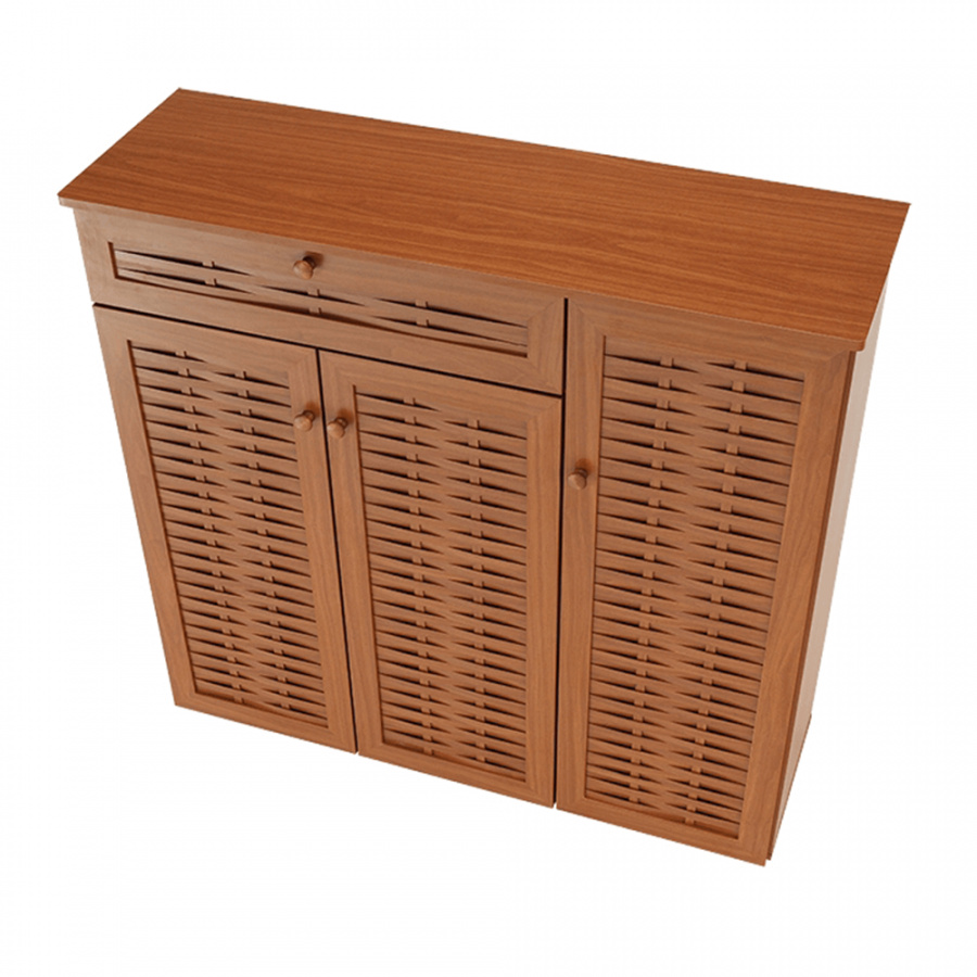 třídveřový botník se zásuvkou FP 04 Materiálové provedení: MDF laminovaná Barevné provedení: americká třešeň Rozměry ŠxHxV: 114,8x36,8x110,2 cm Dodávané v demontu.