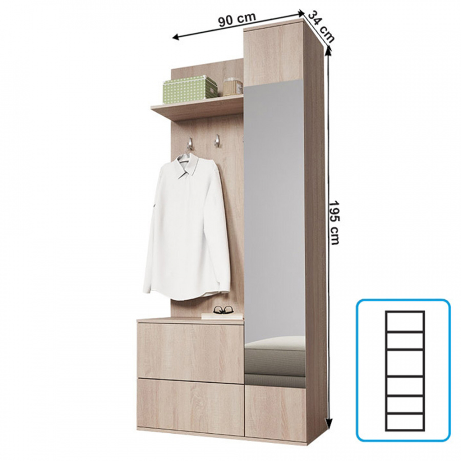 Materiál: laminovaná DTD Barva: dub sonoma Rozměry (ŠxHxV): 90x34x195 cm S výklopným botníkem se zrcadlem S policovou skříní věšákový panel Otevírání PUSH - UP ABS hrany věšáková část Dodávané v demontu