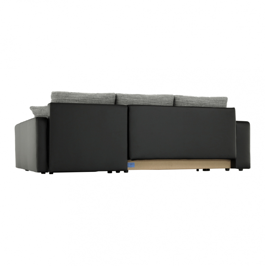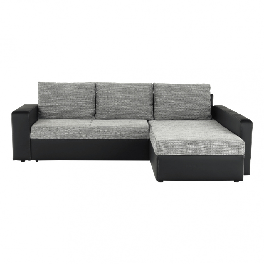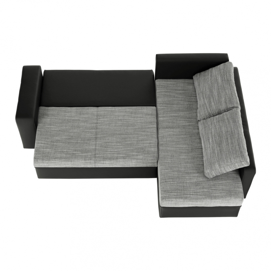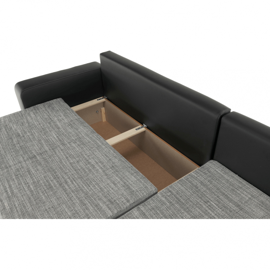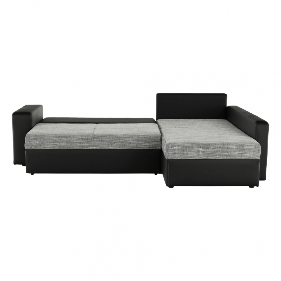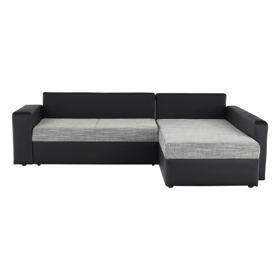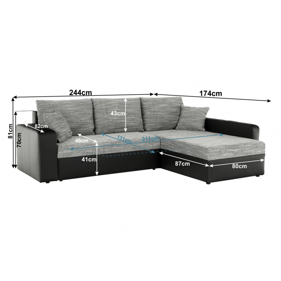 univerzální (L / P) rohová rozkládací sedací souprava s úložným prostorem, provedení: ekokůže černá 329/06 + šenil šedá látka 424/06. Rozměry (ŠxHxV): 244x174x70/81 cm, plocha na spaní 131x211 cm.Výška spodního prostoru od podlahy: 3 cm