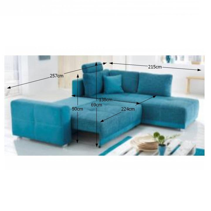Sedací souprava univerzální ORLAN materiál: látka barevné provedení: šenil tyrkysová 434/03 / miktofáza tyrkysová 363/03 rozměry: (ŠxHxV): 257x215x50 / 69 cm Výška spodního prostoru od podlahy: 3 cm Dodávané v demontu.