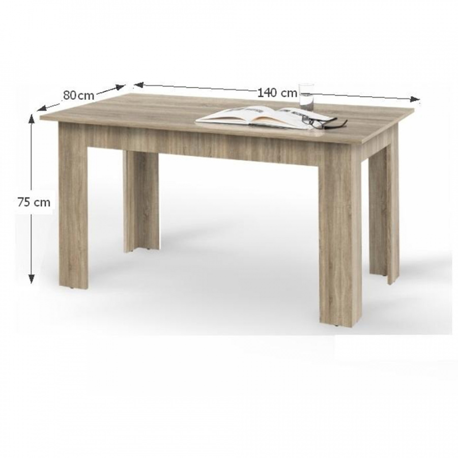 jídelní stůl, materiál: DTD laminovaná (plát stolu), provedení: dub sonoma, rozměry (ŠxHxV): 140x80x75 cm, vhodný pro 6 osob. Tloušťka materiálu: 18 mm. Dodáván v demontu.