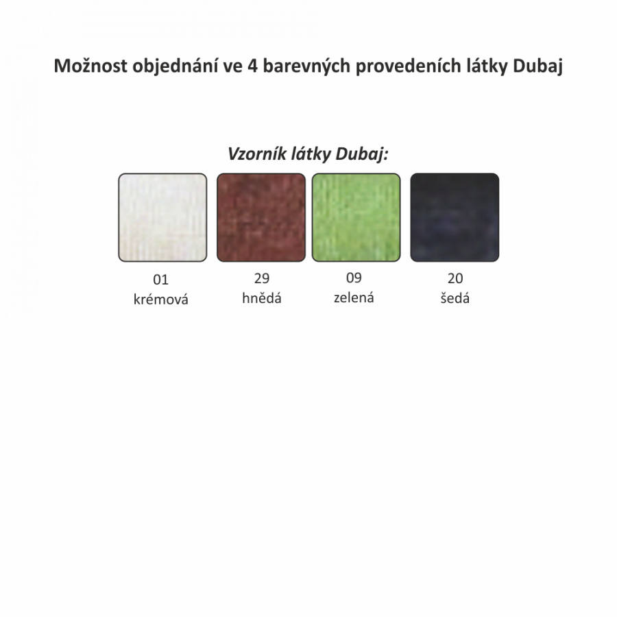 Možnost objednání v 4 barevných provedeních šenil Dubaj v ceně 7.620 Kč. Upozorňujeme, že při objednávkách na nábytek v jiném barevném provedení, jak máme běžně skladem, neumíme zaručit doručení do Vánoc. Totéž platí i při nábytku označeném na objednávku. Doba dodání 14-17 týdnů.