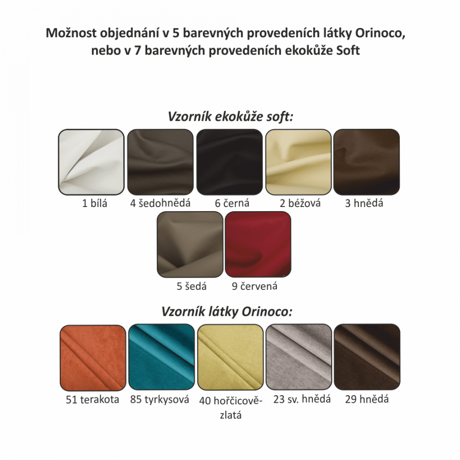 Nabízíme vám možnost objednat si sedačku v 5 dalších barevných provedeních látky Orinoco nebo v 7 barevných provedeních ekokůže Soft dle vzorníku. Cena sedačky na individuální objednávku je verze s rozkladem a úložným prostorem buton R 32.450 Kč a pevná verze bez úložného prostoru buton P 29.890 Kč. Doba dodání 14-17 týdnů.