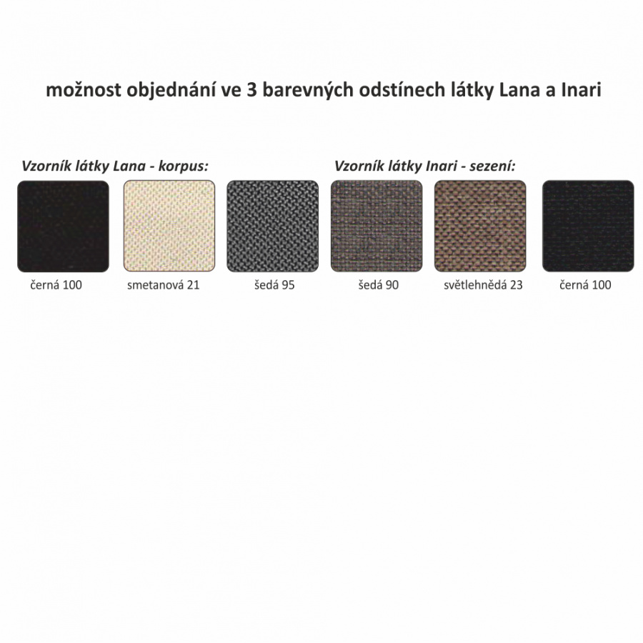 Možnost objednání ve 3 barevných odstínech látky Lana a Inari v ceně: 14.280 Kč. Svůj výběr poznamenejte do poznámky v objednávce. Upozorňujeme, že při objednávkách na nábytek v jiném barevném provedení, jak máme běžně skladem, neumíme zaručit doručení do Vánoc. Totéž platí i při nábytku označeném na objednávku. Doba dodání 14-17 týdnů.týdnů.