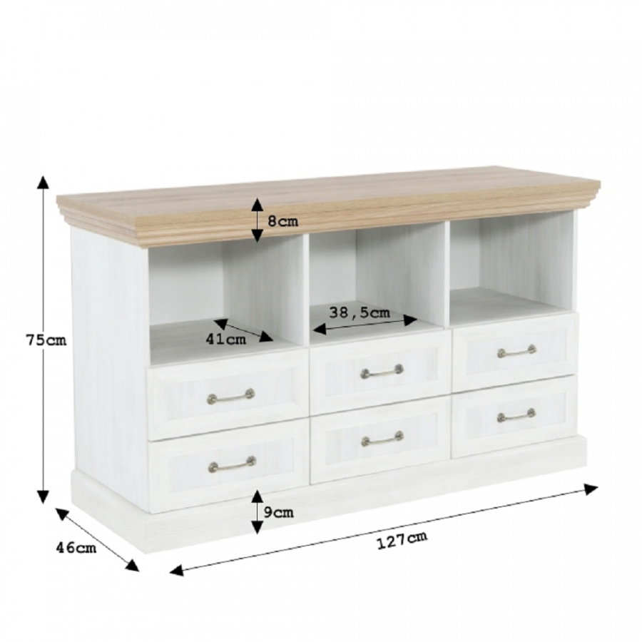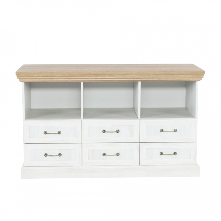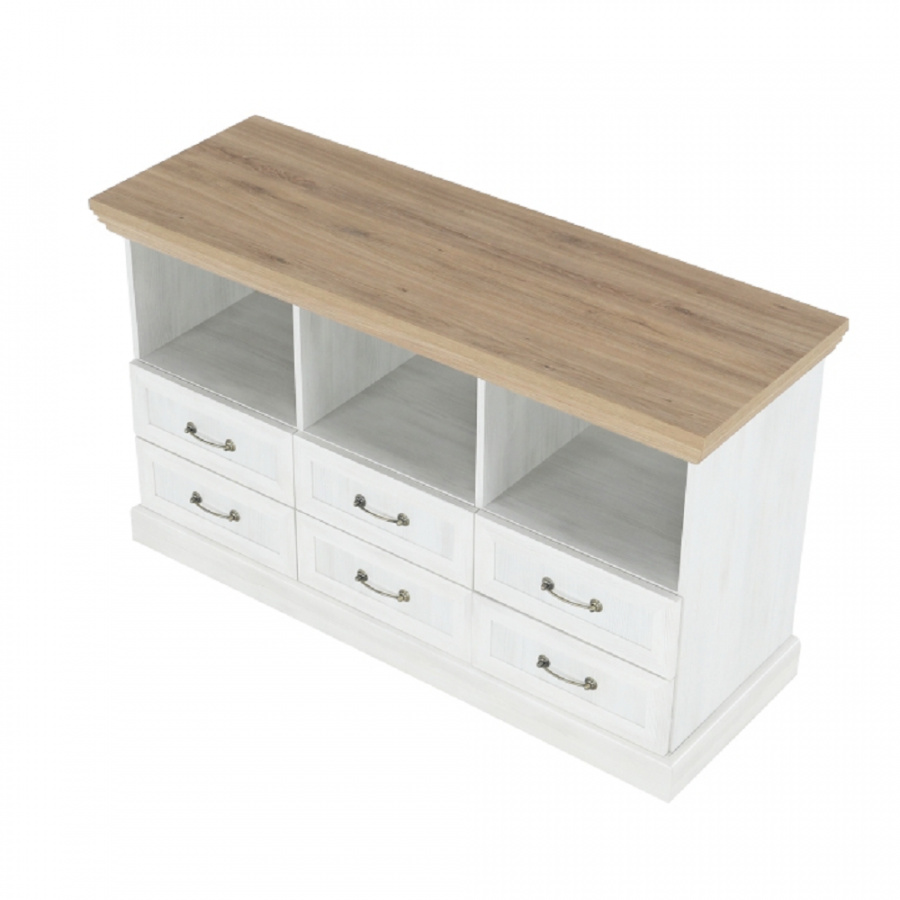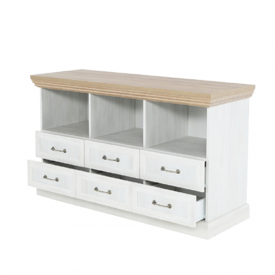 RTV stolek RS se šesti šuplíky a třemi policemi z elegantního sektorového
