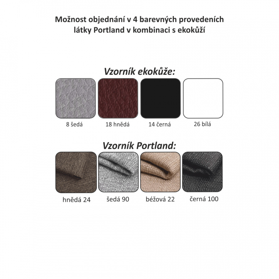 Vybrat si můžete iz dalších 4 barevných provedení ekokůže a 4 barevných provedení látky Portland podle přiloženého vzorníku. Dodací lhůta je 14-17 týdnů. Váš výběr poznamenejte přímo do poznámky v objednávce. Cena sedačky na individuální objednávku je 34.590 Kč. Upozorňujeme, že při objednávkách na nábytek v jiném barevném provedení, jak máme běžně skladem, neumíme zaručit doručení do Vánoc. Totéž platí i při nábytku označeném na objednávku.