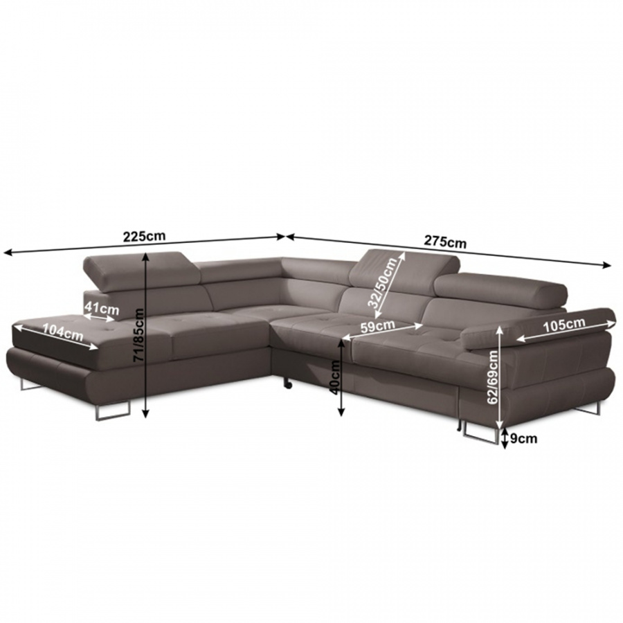 Rozměry (ŠxHxV): 275x225x71 / 85 cm, Výška sedu: 40 cm, Hloubka sedu: 59 cm. Výška spodního prostoru od podlahy: 9 cm.