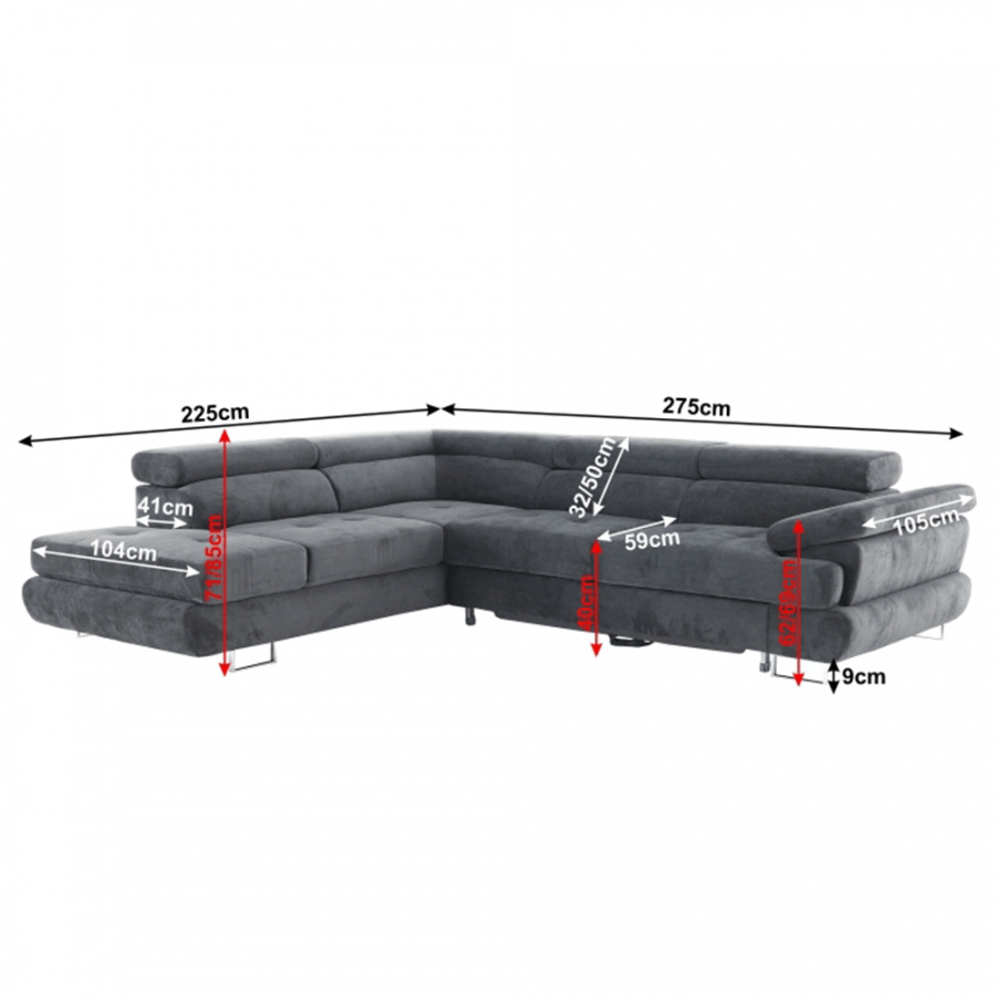 Rozměry (ŠxHxV): 275x225x71 / 85 cm, Výška sedu: 40 cm, Hloubka sedu: 59 cm. Výška spodního prostoru od podlahy: 9 cm.