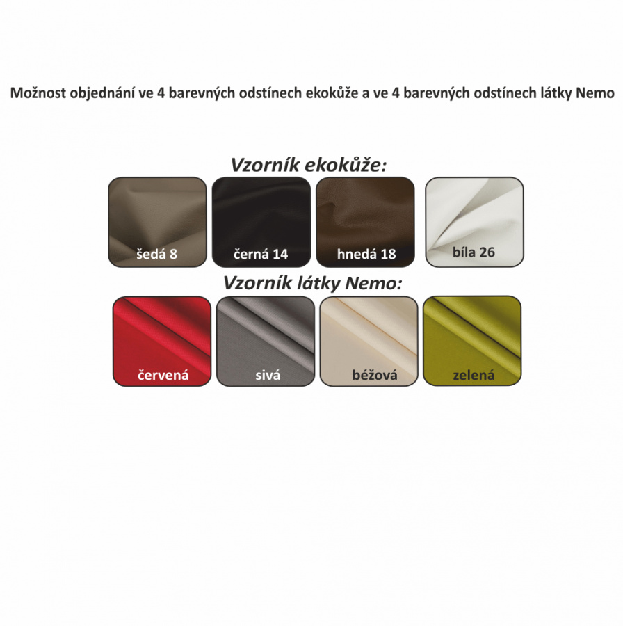 Možnost objednání v 4 barevných odstínech ekokůže a ve 4 barevných odstínech látky Nemo.