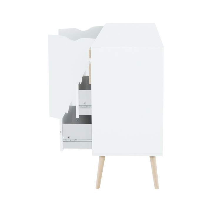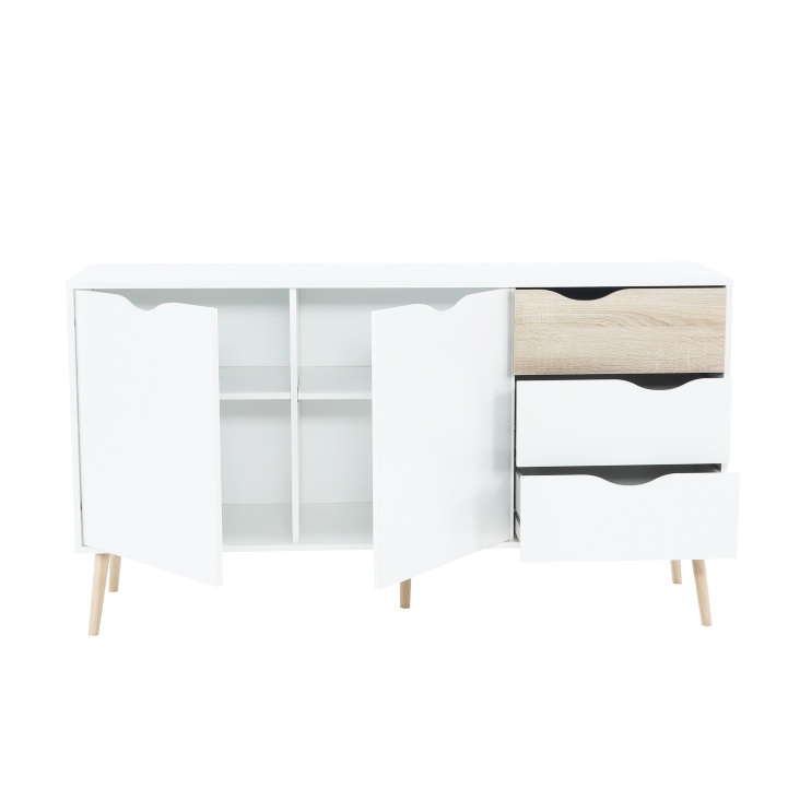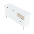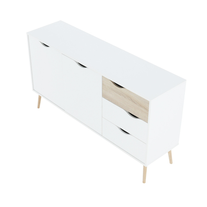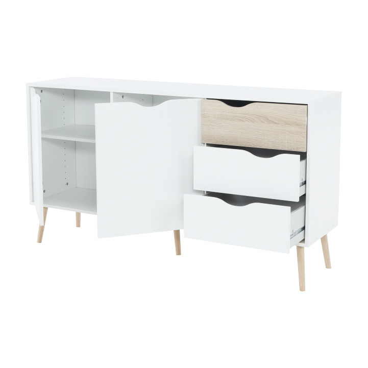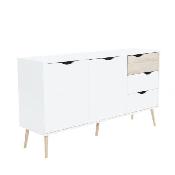 Komoda 75381 Materiál: DTD laminovaná Provedení: dub sonoma / bílá Rozměry (ŠxHxV): 147,1x39,1x81 cm dvoje dvířek 4 poličky 3 šuplíky Tloušťka materiálu: 1,6 cm Výška nohou: 15 cm Dodávané v demontu