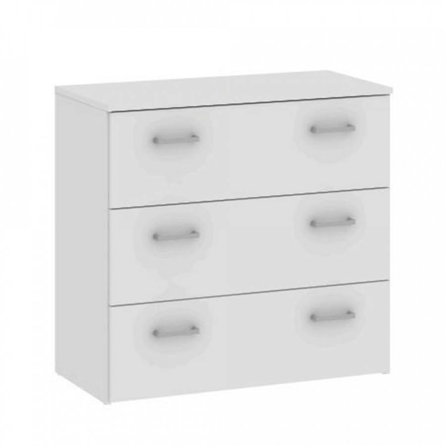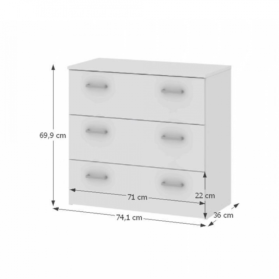Komoda GARBO 3 Materiál: DTD laminovaná Provedení: bílá Rozměry komody (ŠxHxV): 74,1x36x69,9 cm Rozměry šuplíku (ŠxV): 71x22 cm Tloušťka materiálu korpus: 12 mm Tloušťka materiálu vrchní plát: 15 mm 3 šuplíky Dodávané v demontu.