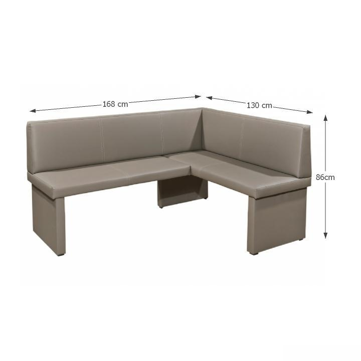 rohová lavice pravé provedení Materiál: ekokůže / kov Barevné provedení: capuccino Rozměry (ŠxVxH): 168x130x86 cm Výška sedu: 48 cm Hloubka sedu: 41 cm Nosnost lavice: max 250 kg Dodávané v demontu
