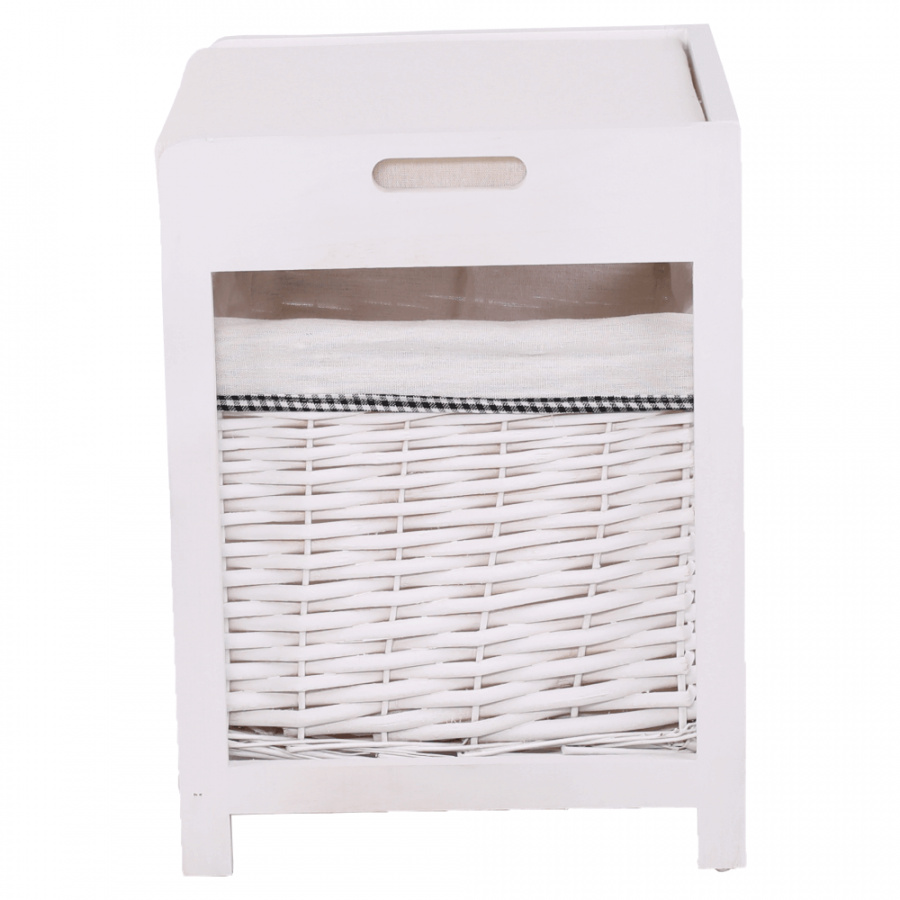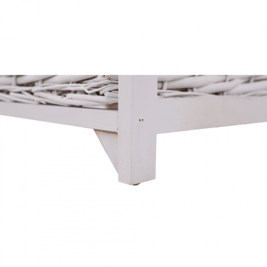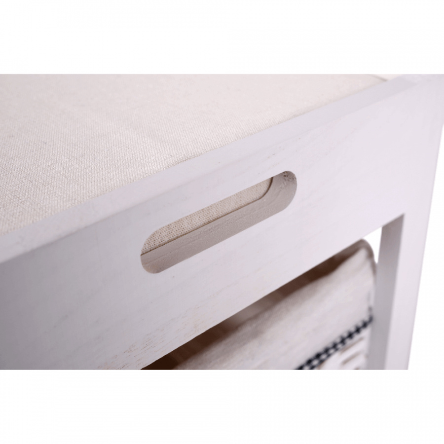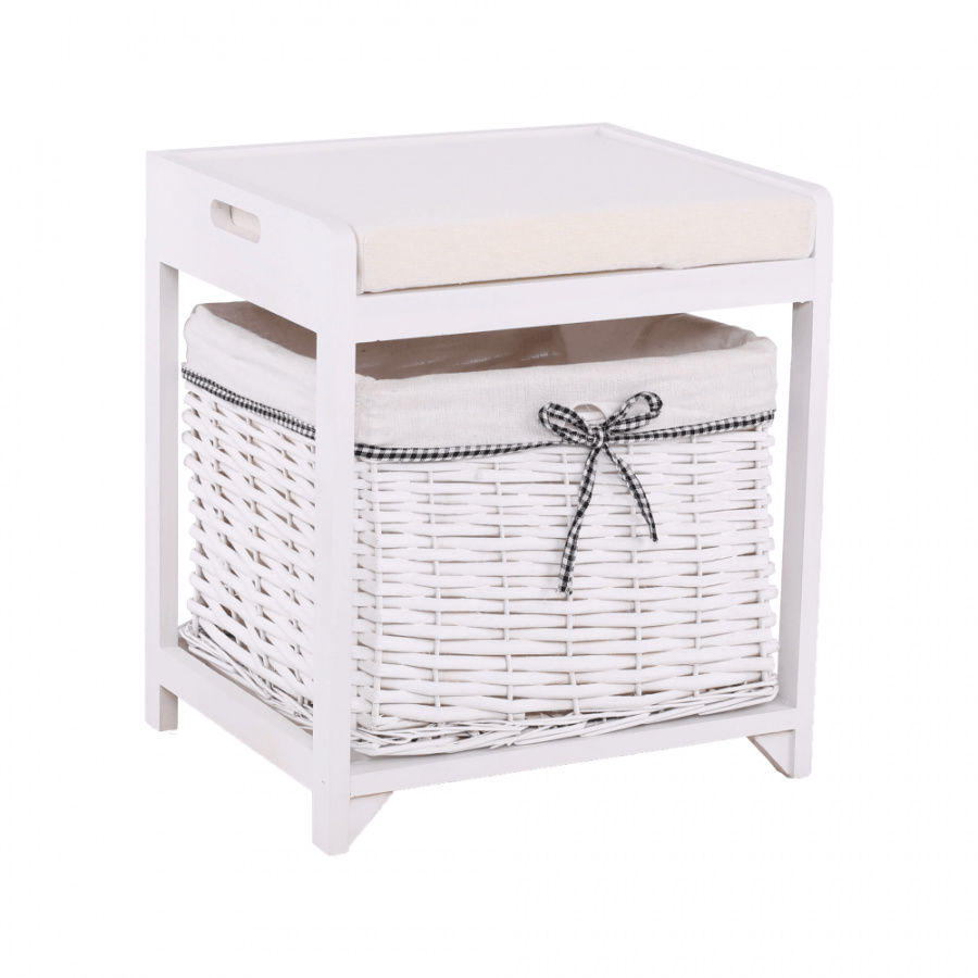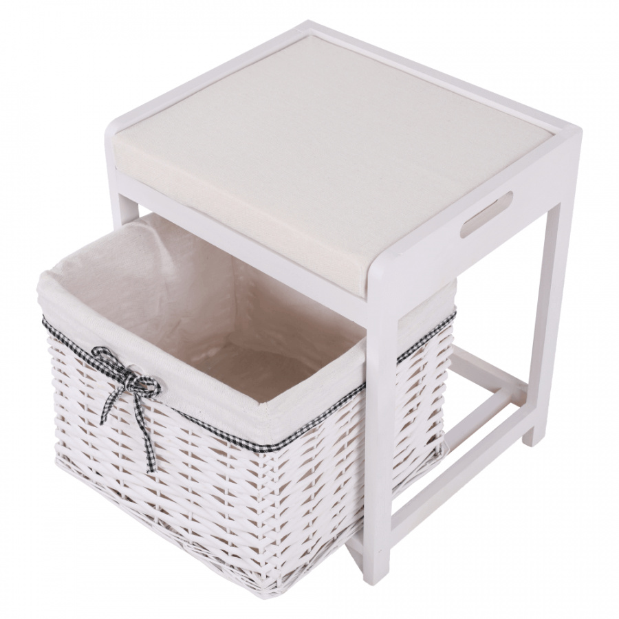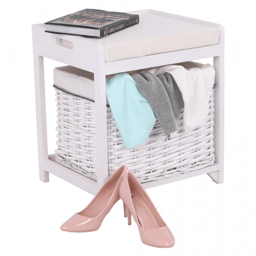 Praktická lavice s proutěným košíkem a polštářem na vrchu
