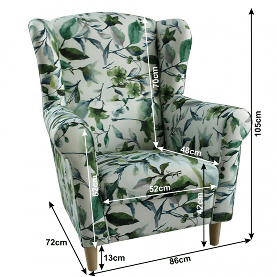 Křeslo-ušák Charlot v barevném provedení látky vzor zelené listí. Dřevěné nožičky v barevném provedení buk. Rozměry (ŠxHxV): 86x72x105 cm Výška sedu: 42 cm Hloubka sedu: 48 cm Možnosť objednania v 6 farebných prevedeniach látky alova v cene 5.980 Kč alebo látky Soro v cene 6.750 Kč. Upozorňujeme, že při objednávkách na nábytek v jiném barevném provedení, jak máme běžně skladem, neumíme zaručit doručení do Vánoc. Totéž platí i při nábytku označeném na objednávku. Doba dodání 14-17 týdnů.