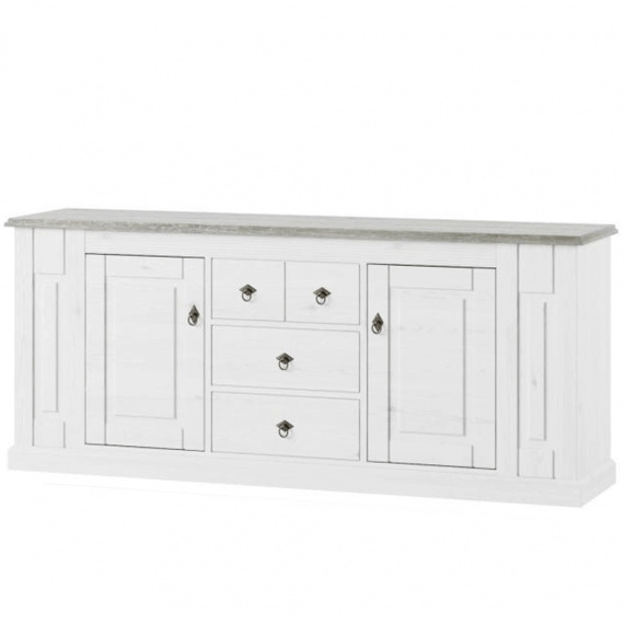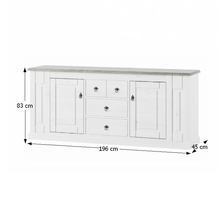 Komoda LM 46 LIONA Materiál: DTD laminovaná Provedení: bílá Rozměry (ŠxHxV): 196x45x83 cm úložný prostor dvoudveřová čtyři šuplíky kovové úchytky Systém tichého zavírání dvířek. Systém tichého dorazu šuplíků. Dodávané v demontu.