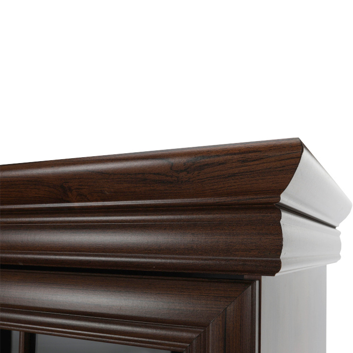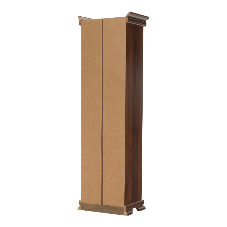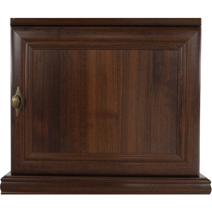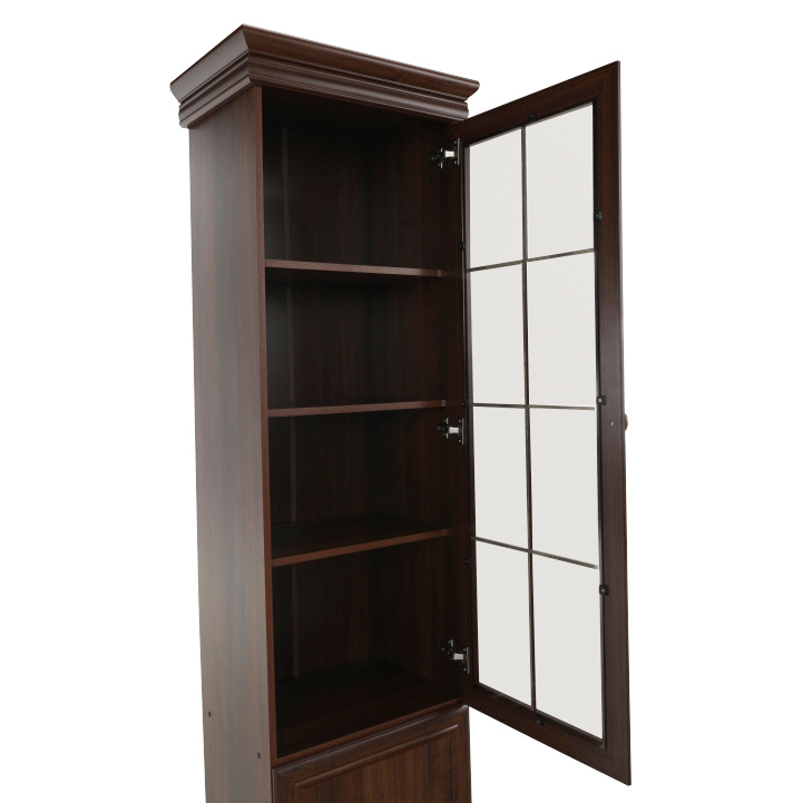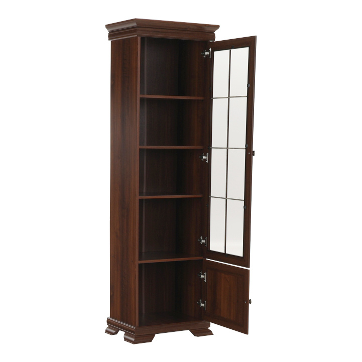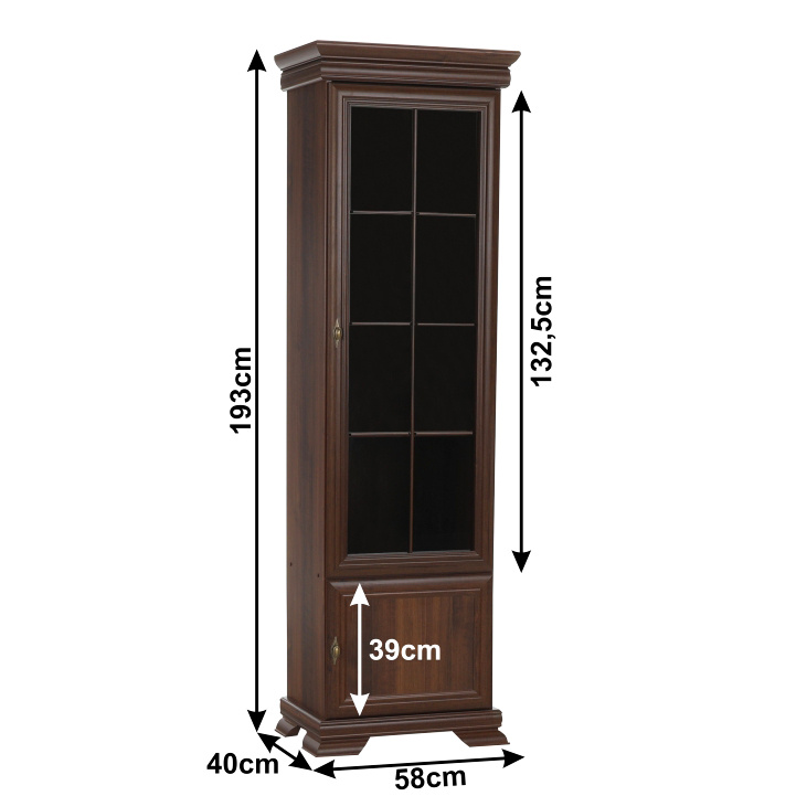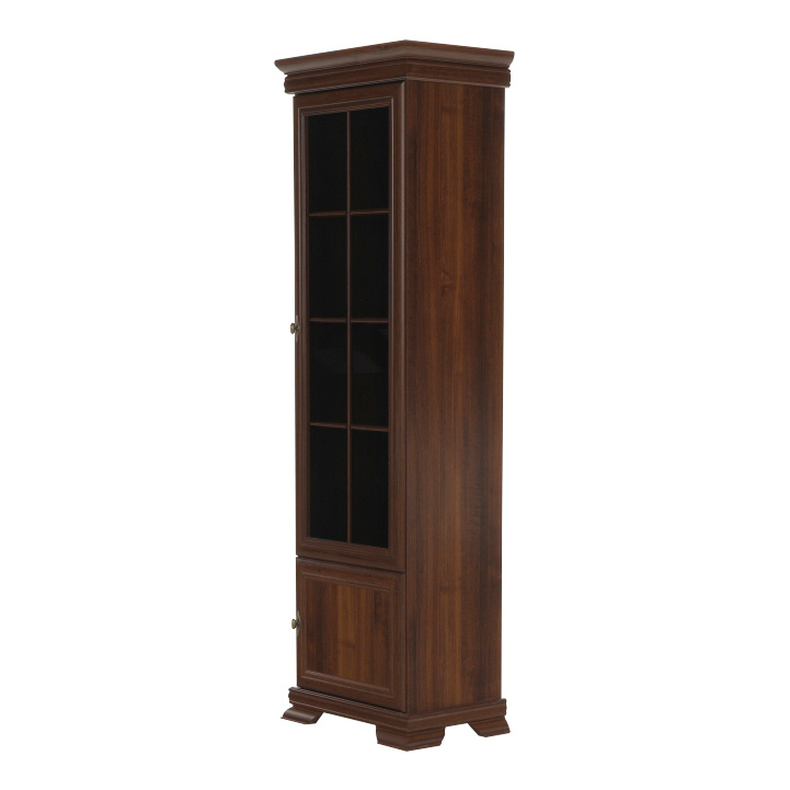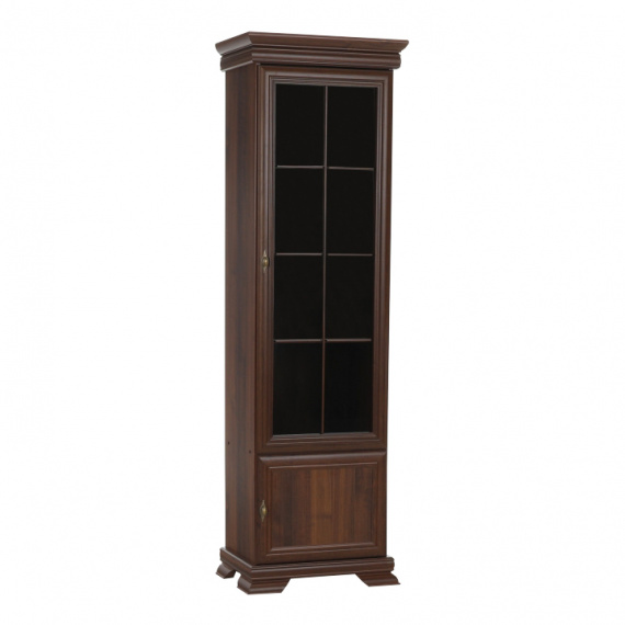 Vitrína KRW1 KORA. Barevné provedení samoa king. Materiál laminovaná DTD, MDF, sklo, kov. Rozměry (ŠxHxV): 58x40x193 cm Tloušťka materiálu korpus: 15 mm Tloušťka materiálu vrchní desky: 22 mm Tloušťka materiálu dolní desky: 22 mm Výška spodního prostoru od podlahy: 10,5 cm