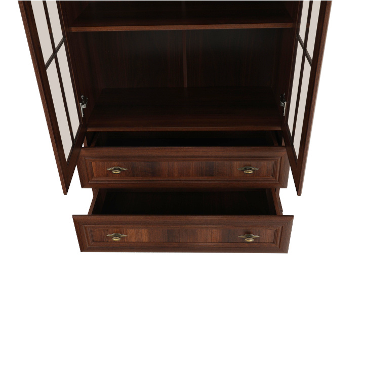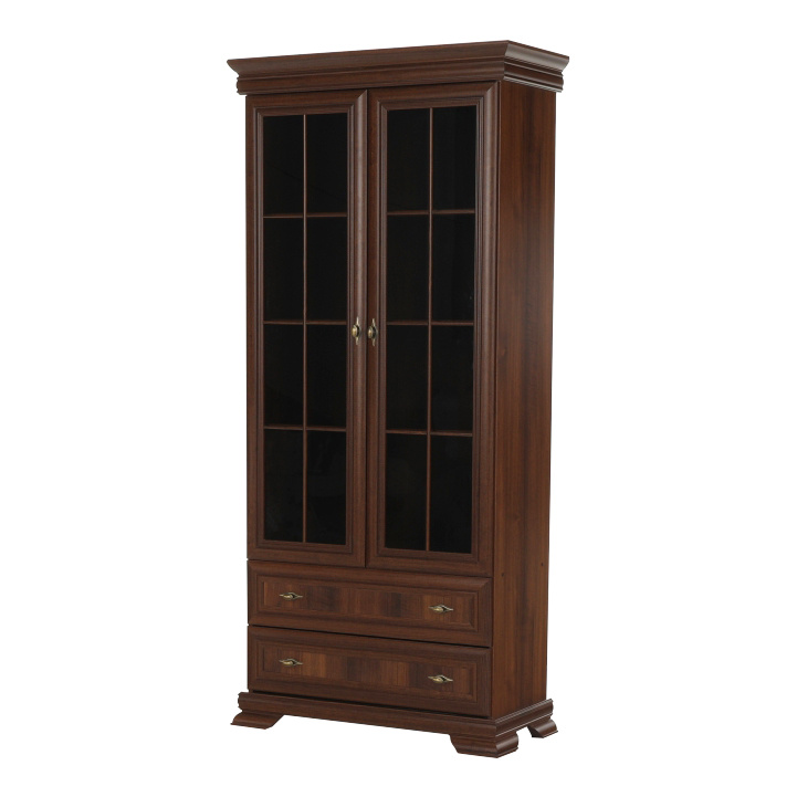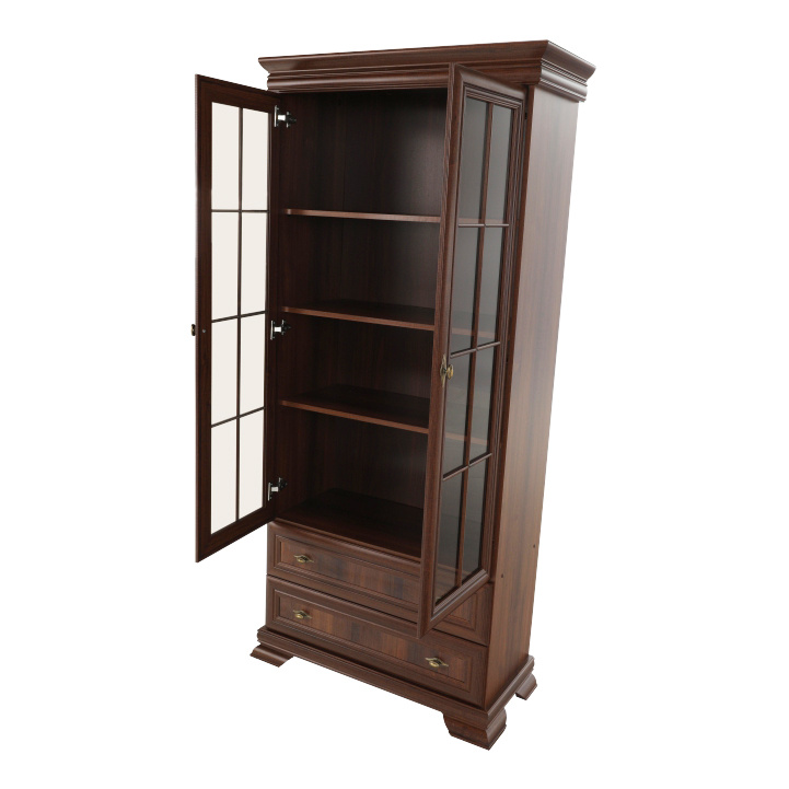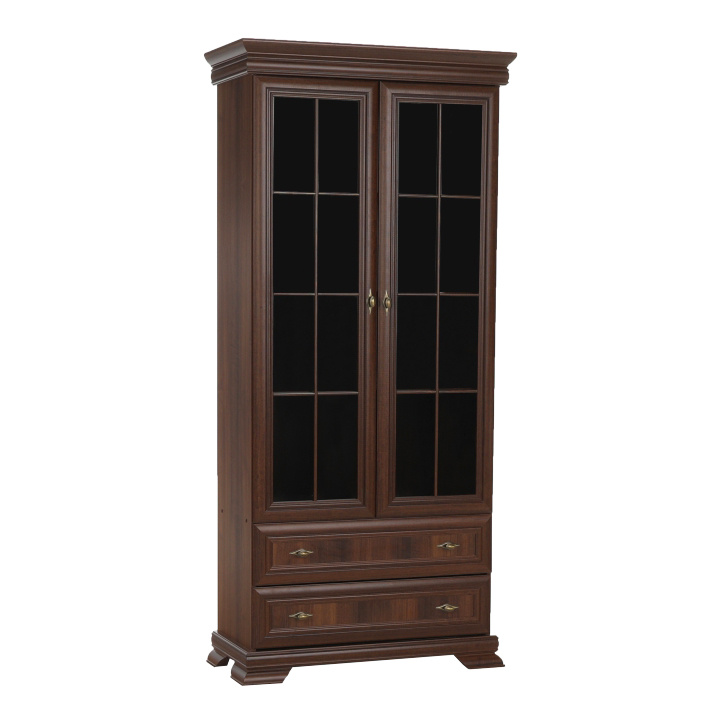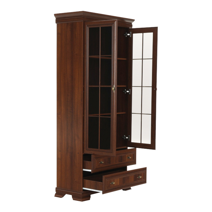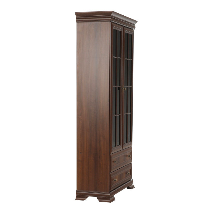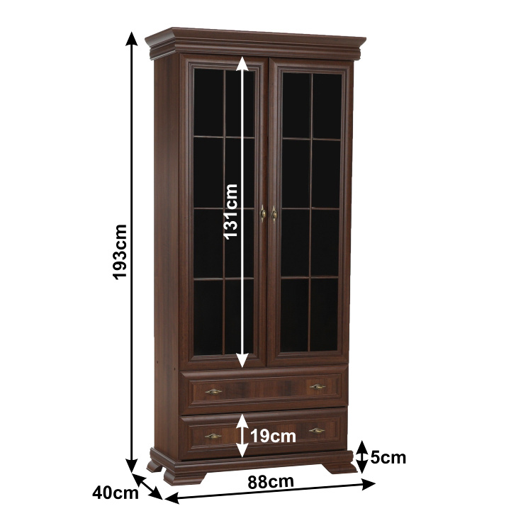 Vitrína KRW2 KORA. Barevné provedení samoa king. Materiál laminovaná DTD, MDF, kov, sklo. Rozměry (ŠxHxV): 88x40x193 cm Tloušťka materiálu korpus: 15 mm Tloušťka materiálu vrchní desky: 22 mm Tloušťka materiálu dolní desky: 22 mm Výška spodního prostoru od podlahy: 10,5 cm