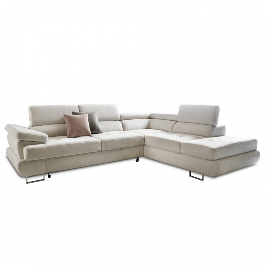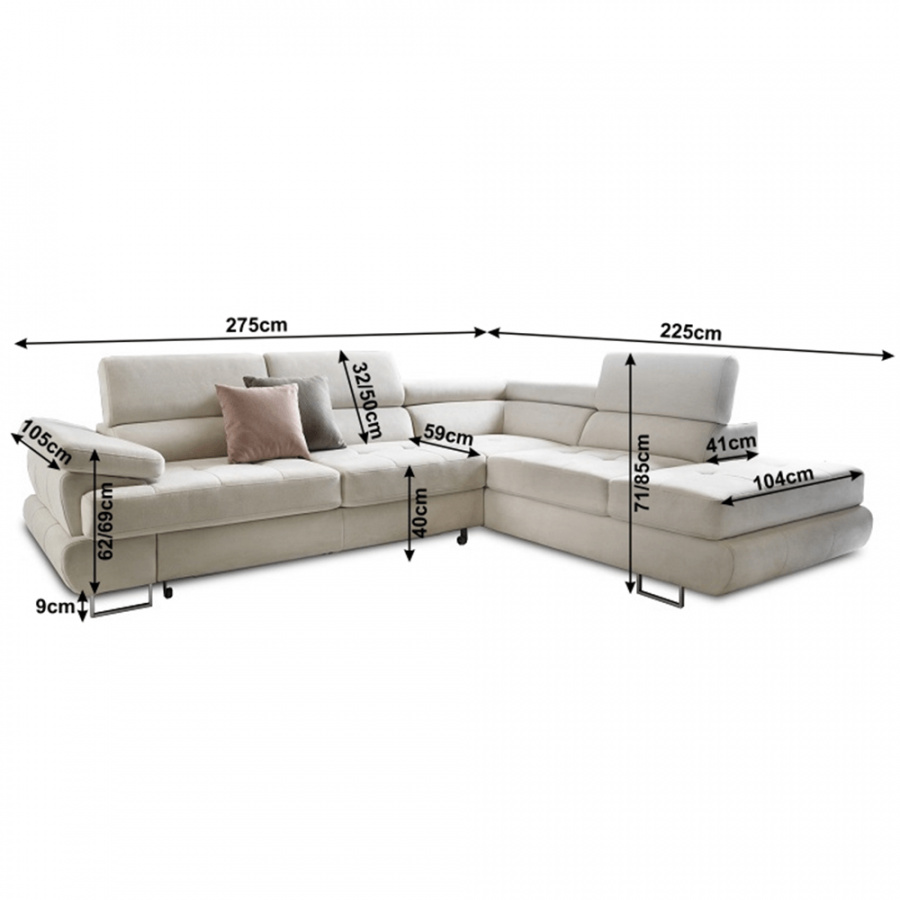celočalouněná rohová sedací souprava v provedení Buton P -Pevná bez rozkladu, s polohovatelným záhlavím, které zajišťuje komfortní opření zad a hlavy, dekorativní prošití sedáků, pravé provedení, materiál: látka svetlehnědá, rozměry ŠxVxH: 275x71 / 85x225 cm. Výška spodního prostoru od podlahy: 9 cm. Na skladě je i rozkládací verze Buton R s úložným prostorem v ceně 30.890 Kč