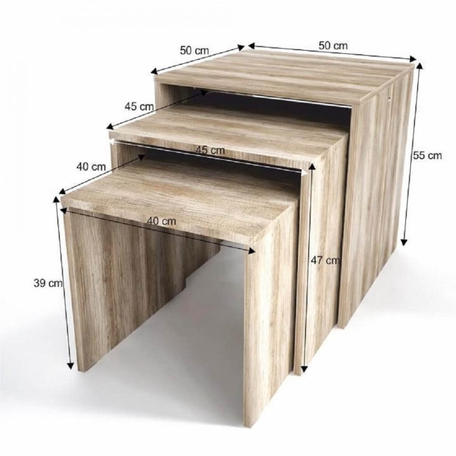Sada tří příručních stolků, SIPANI NEW Materiál: DTD laminovaná Provedení: dub canyon Rozměry (ŠxHxV): 50x50x55cm, 45x45x47 cm, 40x40x39 cm Tloušťka materiálu: 16 mm Dodávané v demontu.