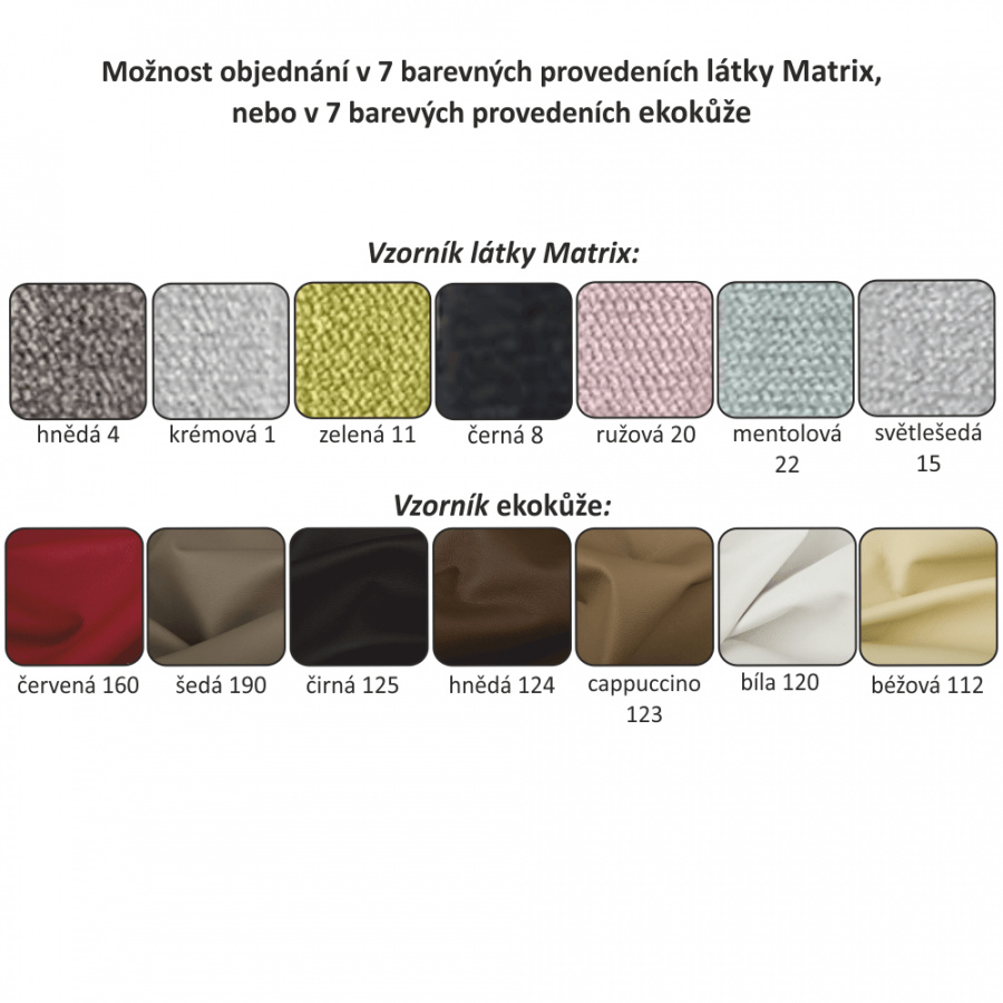 Máme pro vás hned sedm barev látky Matrix a sedm barev ekokůže. Cena sedačky na individuální objednávku je 26.440 Kč. Dodací doba 14-17 týdnů.