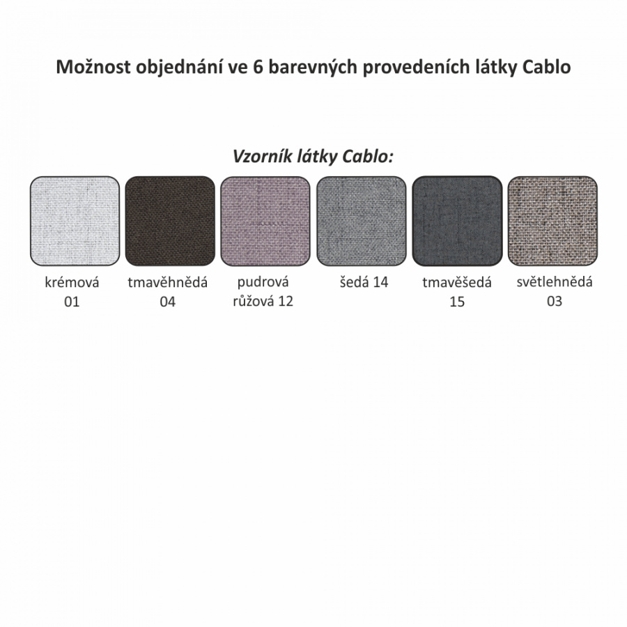 Možnost objednání v 6 barevných odstínech látky Cable v ceně 7.190 Kč. Upozorňujeme, že při objednávkách na nábytek v jiném barevném provedení, jak máme běžně skladem, neumíme zaručit doručení do Vánoc. Totéž platí i při nábytku označeném na objednávku. Doba dodání 14-17 týdnů.