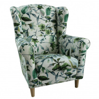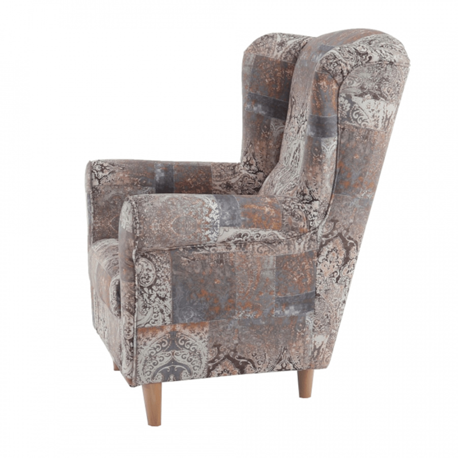 Křeslo-ušák Charlot v provedení látky vintage hnědá 1026. Dřevěné nožičky v barevném provedení buk.