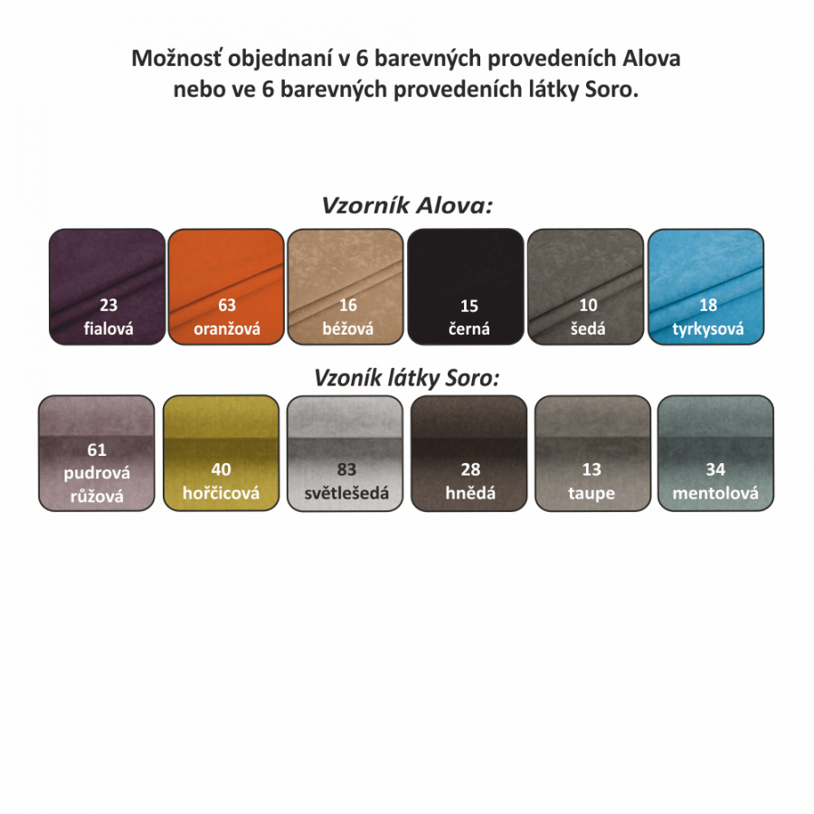 Možnosť objednania v 6 farebných prevedeniach látky alova v cene 5.980 Kč alebo látky Soro v cene 6.750 Kč. Upozorňujeme, že při objednávkách na nábytek v jiném barevném provedení, jak máme běžně skladem, neumíme zaručit doručení do Vánoc. Totéž platí i při nábytku označeném na objednávku. Doba dodání 14-17 týdnů.