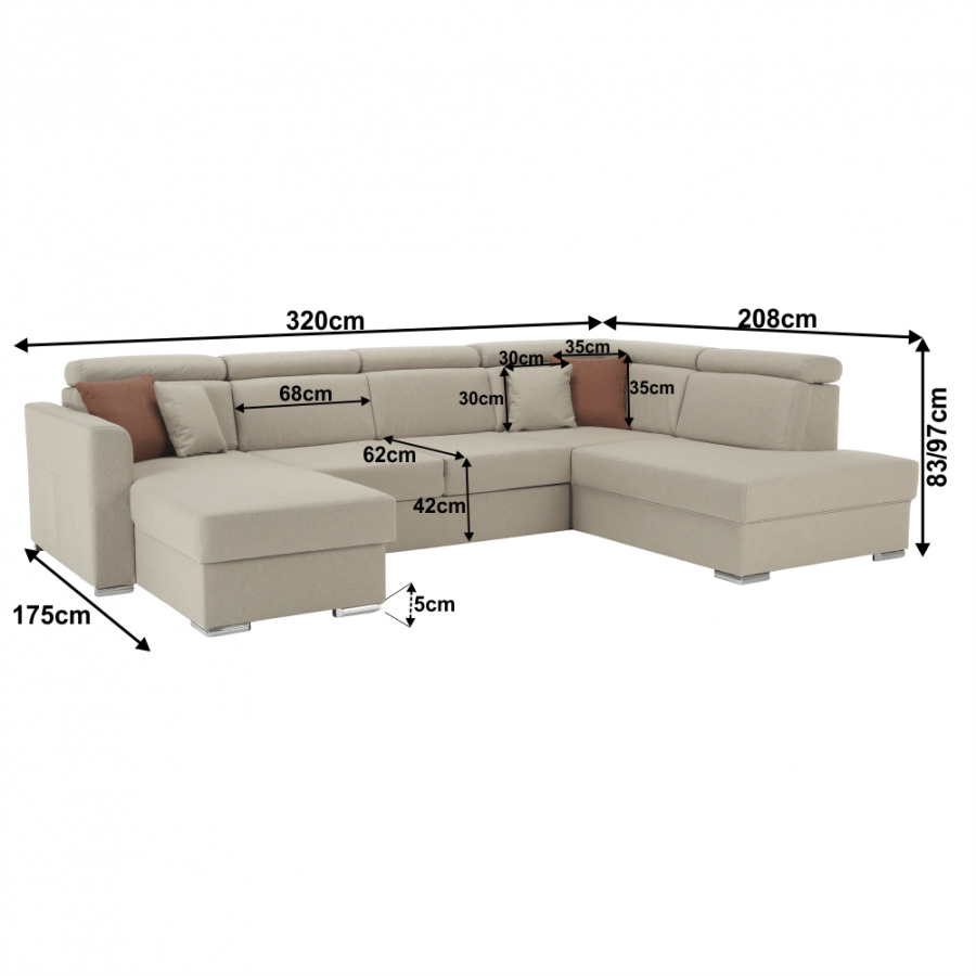 Rozměry: (ŠxHxV): 320x208-175x83-97 cm, plocha na spaní (ŠxD): 130x260cm