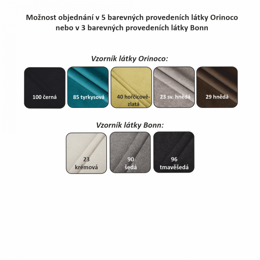 Možnost objednat v 5 barevných odstínech látky Orinoco a v 3 barvách látky Bonn dle vzorníku v ceně 32.490 Kč. Dodací lhůta 14-17 týdnů.