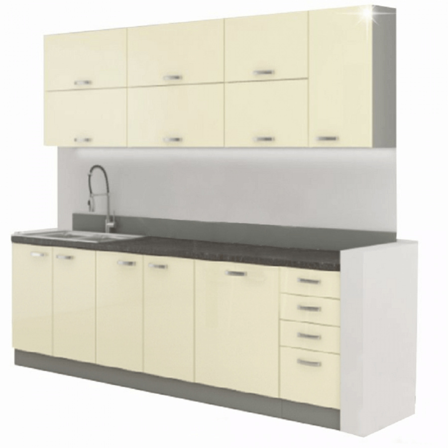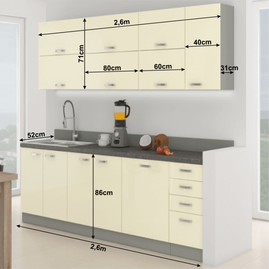 tloušťka pracovní desky 28 mm, horní i dolní rozměr 2,6 m, dolní skříňky ZZ jsou dodávány včetně pracovní desky a dolní lišty, dřezová skříňka bez pracovní desky. Sektorové skrinky sú dodávané bez pracovnej dosky vrátane spodnej lišty. Možnosť dokúpiť PD travertyn v cene 1.150 Kč/1m. Možnosť dokúpiť univerzálny Ľ/P drez v cene 1.990 Kč.