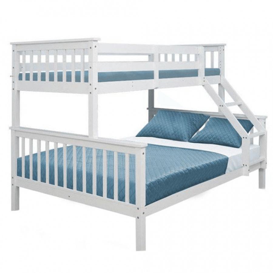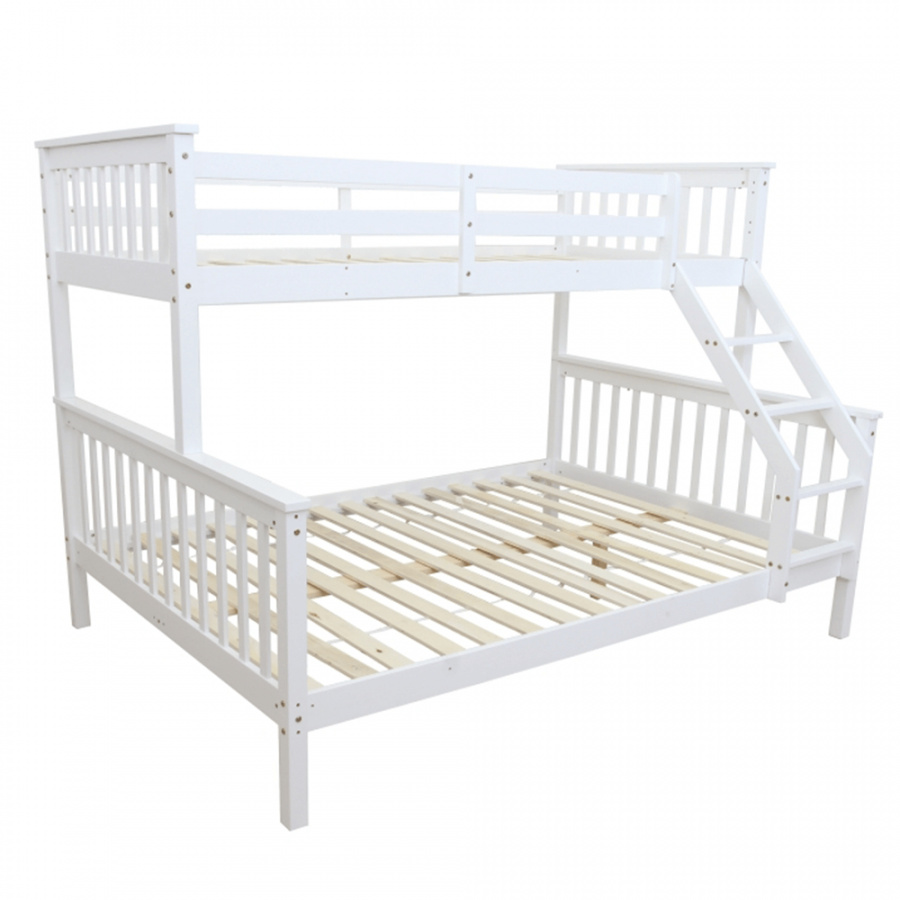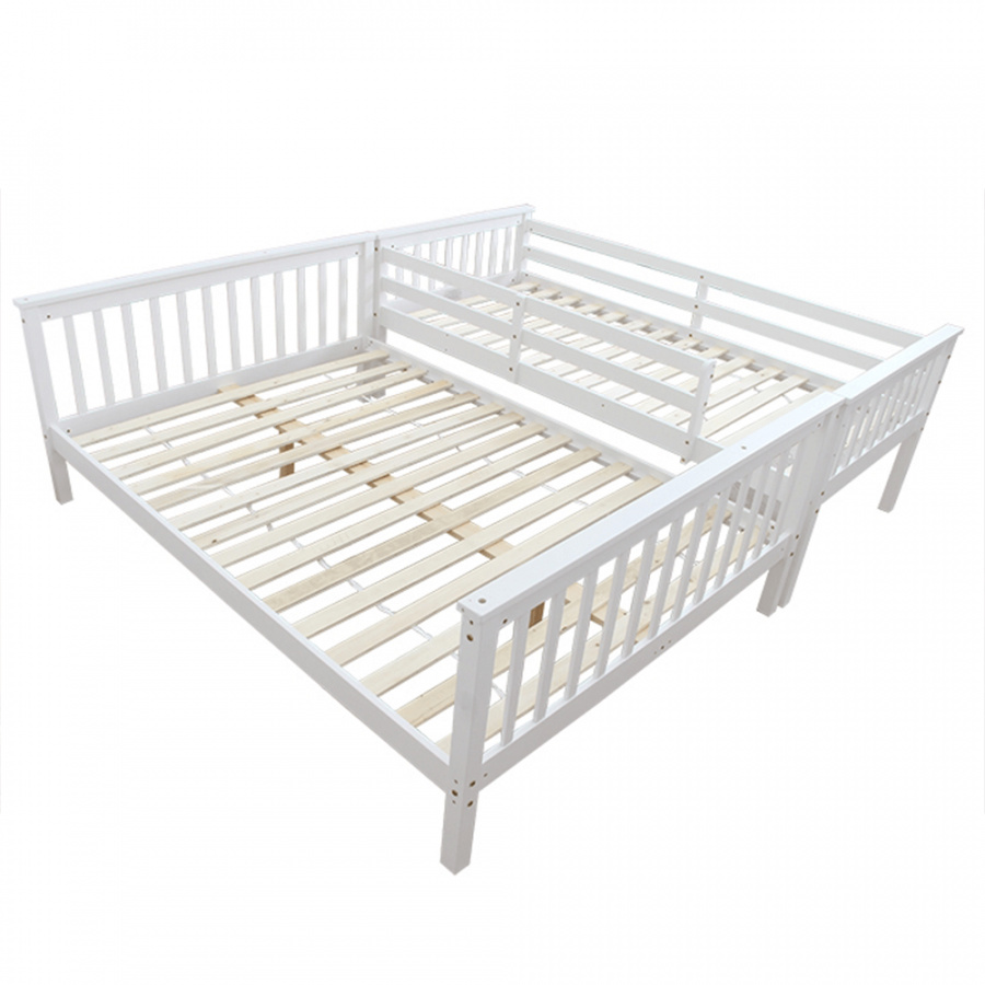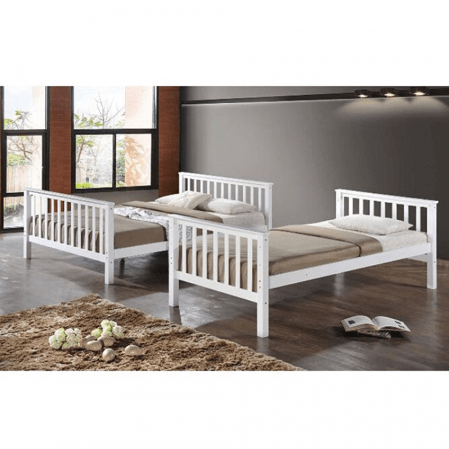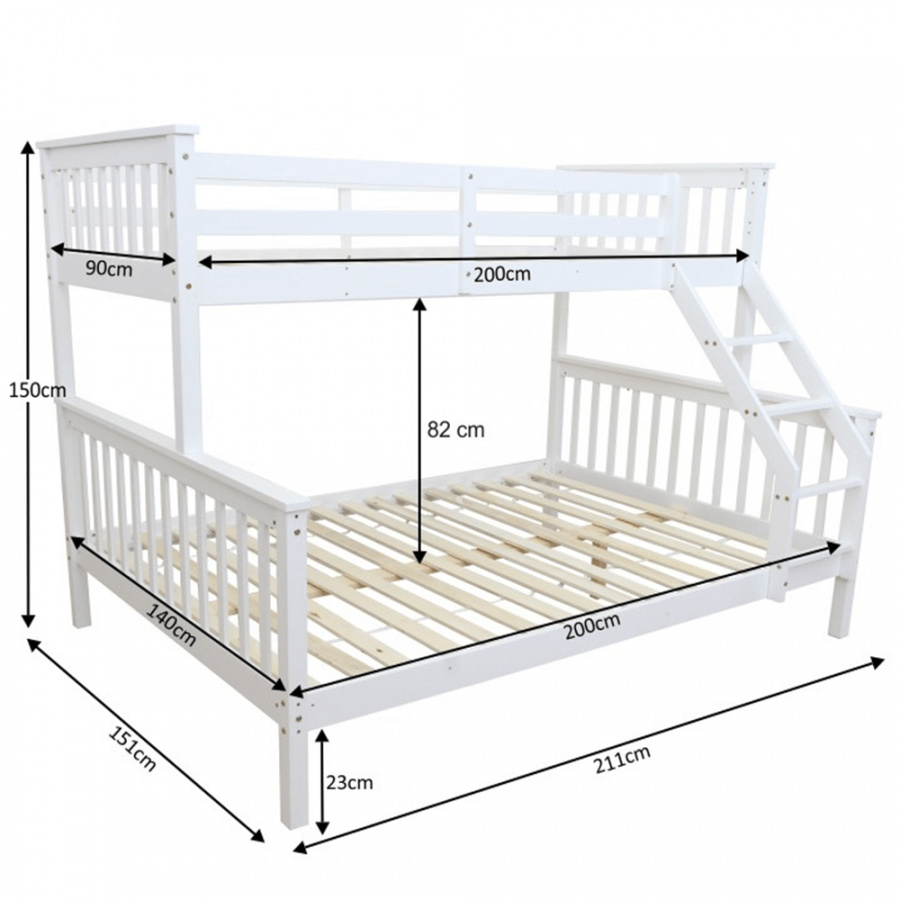 Dvoupatrová rozložitelná postel s roštem BAGIRA Barva: bílá Materiál: borovicové dřevo / překližka (rošt) Rozměry (ŠxHxV): 211x151x150 cm Plocha na spaní dolní lůžko (ŠxH): 140x200 cm Plocha na spaní horní lůžko (ŠxH): 90x200 cm Výška po rošt spodního lůžka: 23 cm Lůžka mají po rozložení odlišnou výšku Maximální výška matrace na horní lůžko: 14 cm Tloušťka materiálu: 20 mm Tloušťka materiálu nohou (ŠxH): 50x50 mm Dodávané s latkovým roštem. Dodávané v demontu. Vhodné pro 3 osoby