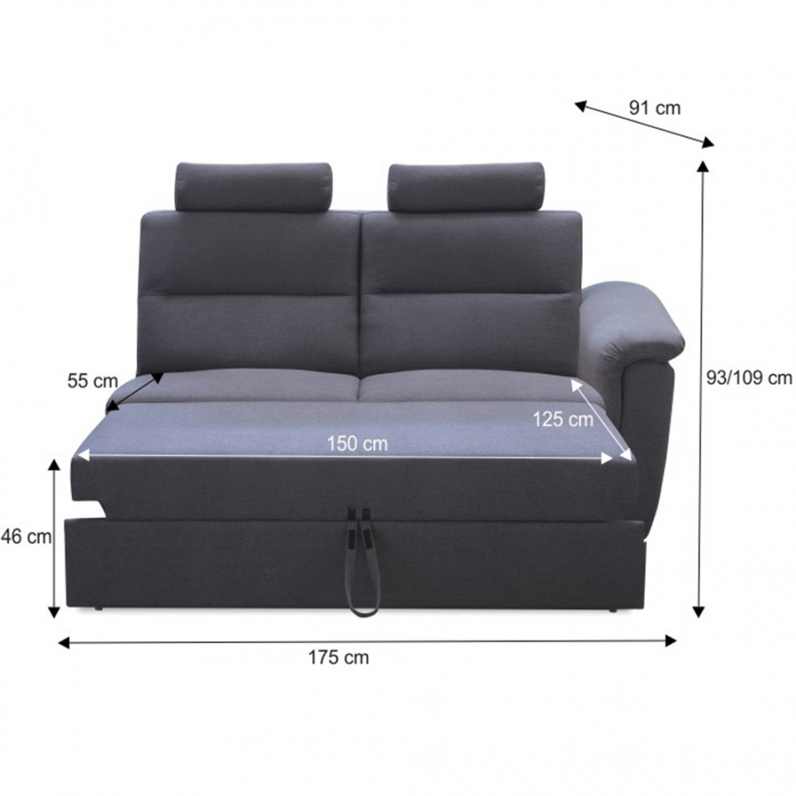 Rozměry (ŠxHxV): 175x91x93 / 109 cm, plocha na spaní: (ŠxD): 125x150 cm