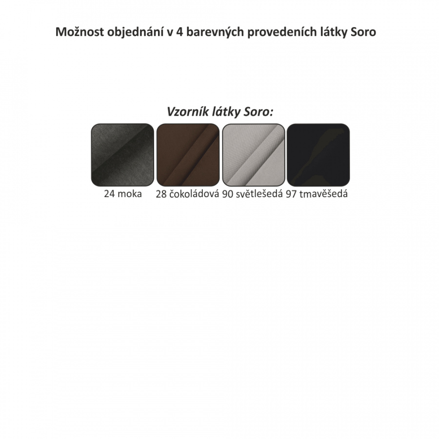 Nabízíme vám možnost vybrat si jakoukoliv z dalších 4 trendových barev látky Soro. Sedačka na individuální objednávku je v ceně 34.220 Kč. Doba dodání 14-17 týdnů. Upozorňujeme, že při objednávkách na nábytek v jiném barevném provedení, jak máme běžně skladem, neumíme zaručit doručení do Vánoc. Totéž platí i při nábytku označeném na objednávku.