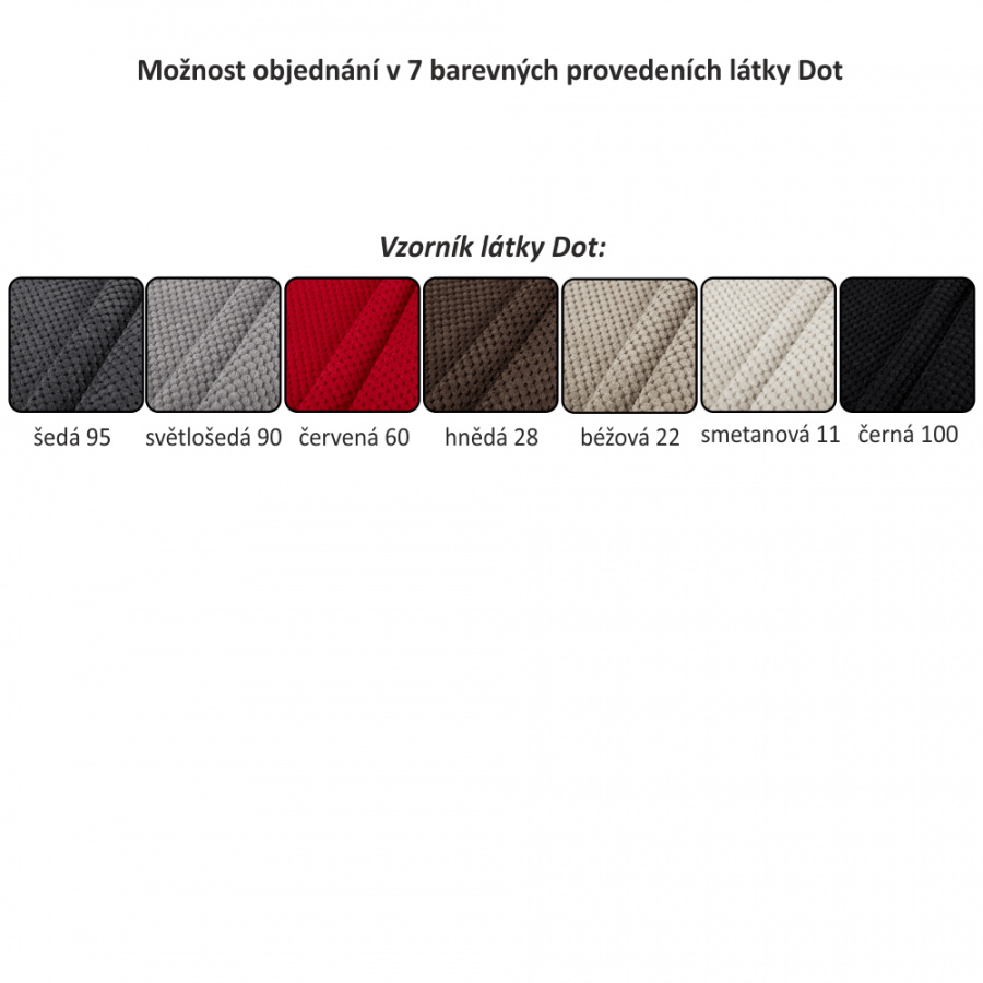 Možnost objednání v 7 provedeních látky Dot v ceně 10.450 Kč. Upozorňujeme, že při objednávkách na nábytek v jiném barevném provedení, jak máme běžně skladem, neumíme zaručit doručení do Vánoc. Totéž platí i při nábytku označeném na objednávku. Doba dodání 14-17 týdnů.