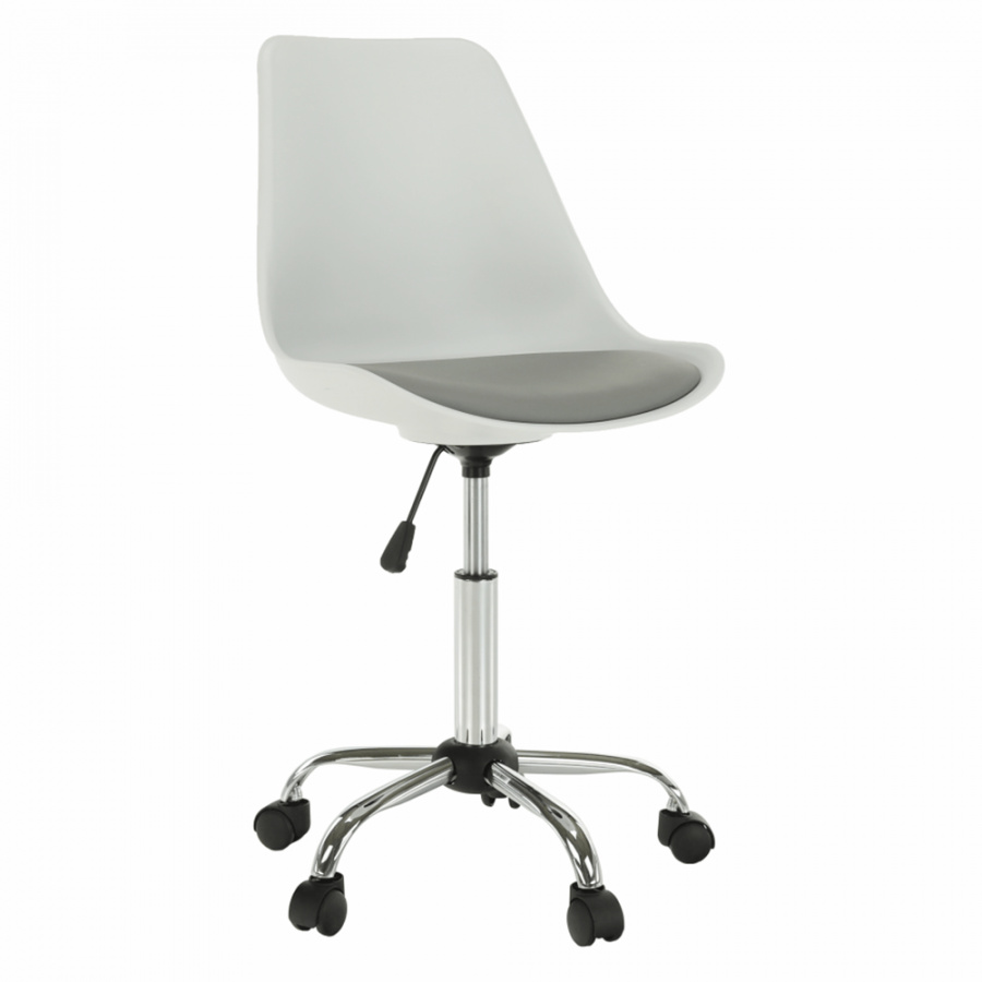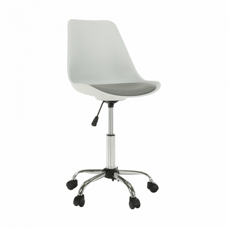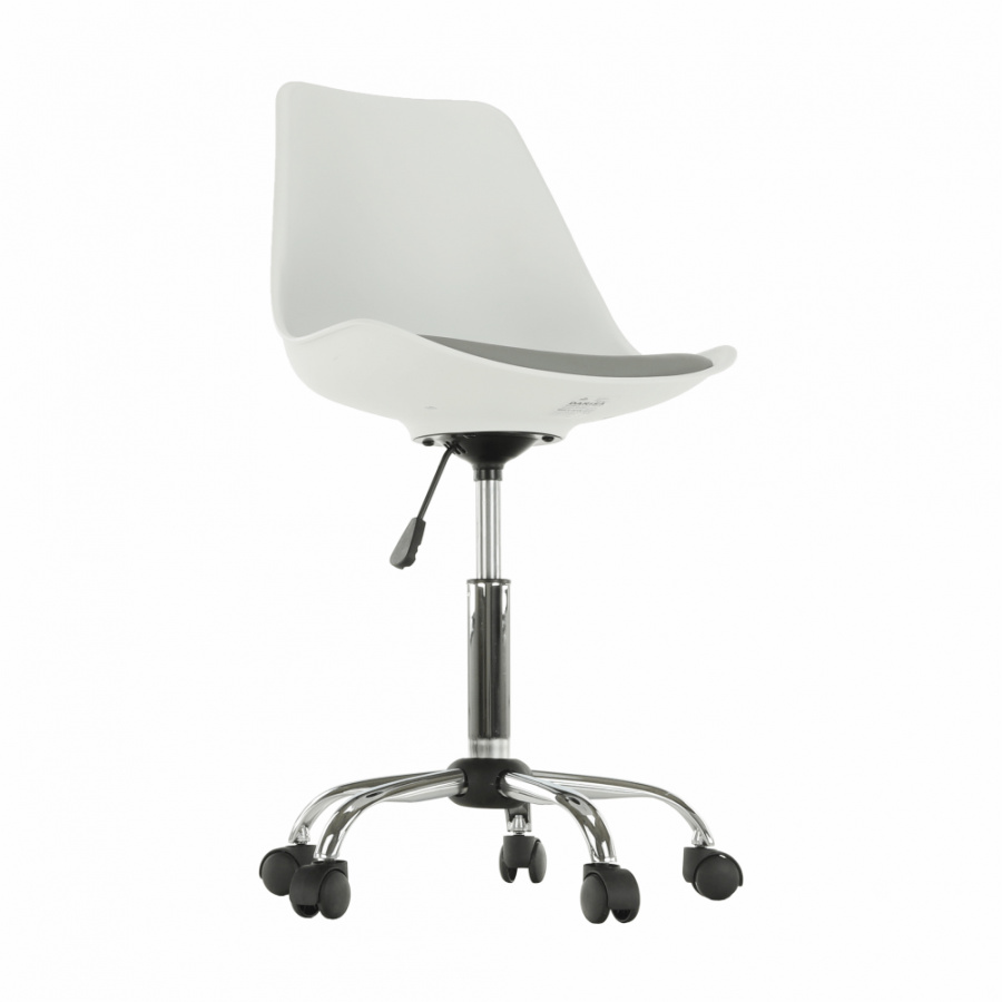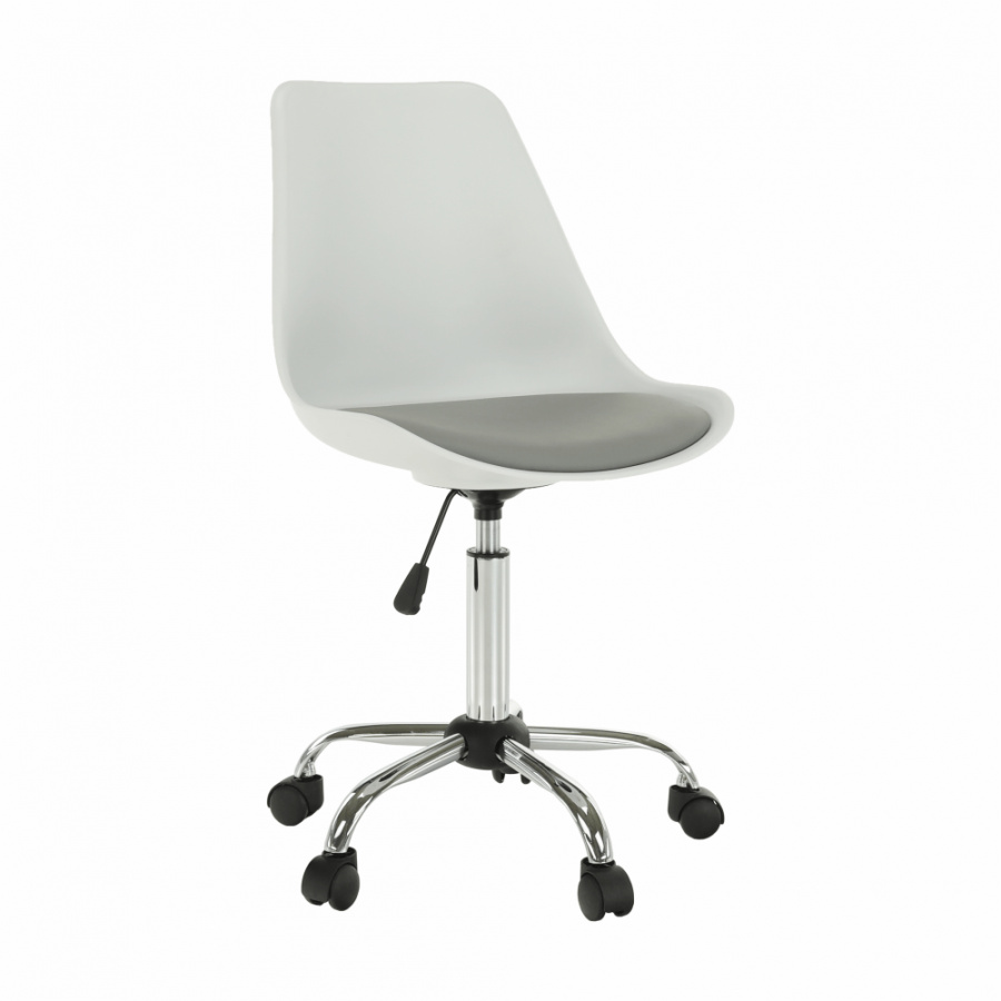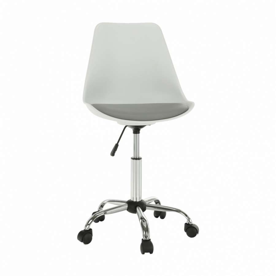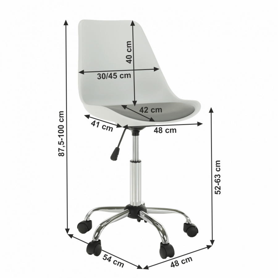 Materiál: plast / ekokůže / chrom Barva: bílá / šedá / chromovaná Rozměry (ŠxHxV): 48x54x87,5-100 cm Nastavitelná výška sedu Výška sedu: 52-63 cm Hloubka sedu: 42 cm Nosnost: 100 kg Opěrka zad (ŠxV): 30 / 45x40 cm Sedadlo (ŠxH): 48x41 cm Dodávané v demontu