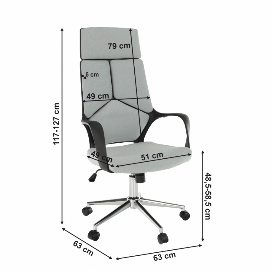 Materiál: plast / chrom / látka Barva: černá / šedá Rozměry (ŠxHxV): 63x63x117-127 cm Nastavitelná výška sedu Výška sedu: 48,5-58,5 cm Hloubka sedu: 45 cm Nosnost: 100 kg Plastové područky funkce houpání Opěrka zad (ŠxV): 49x79 cm Sedadlo (ŠxHxV): 51x49x49 cm Dodávané v demontu