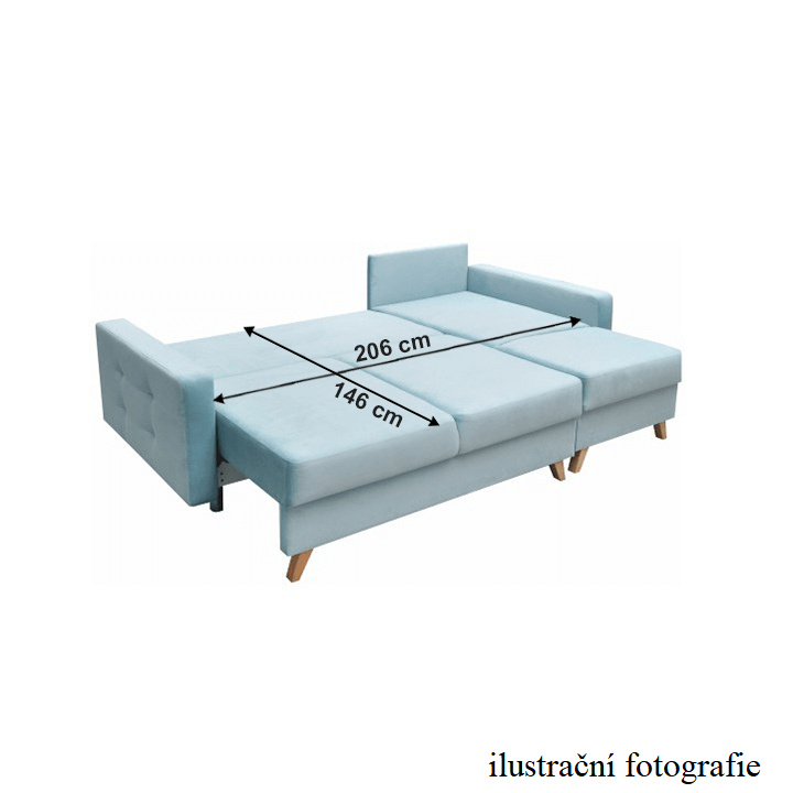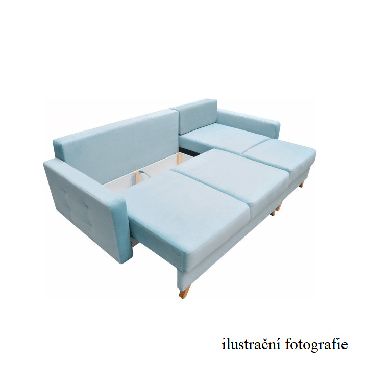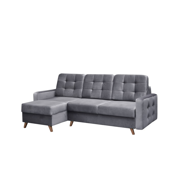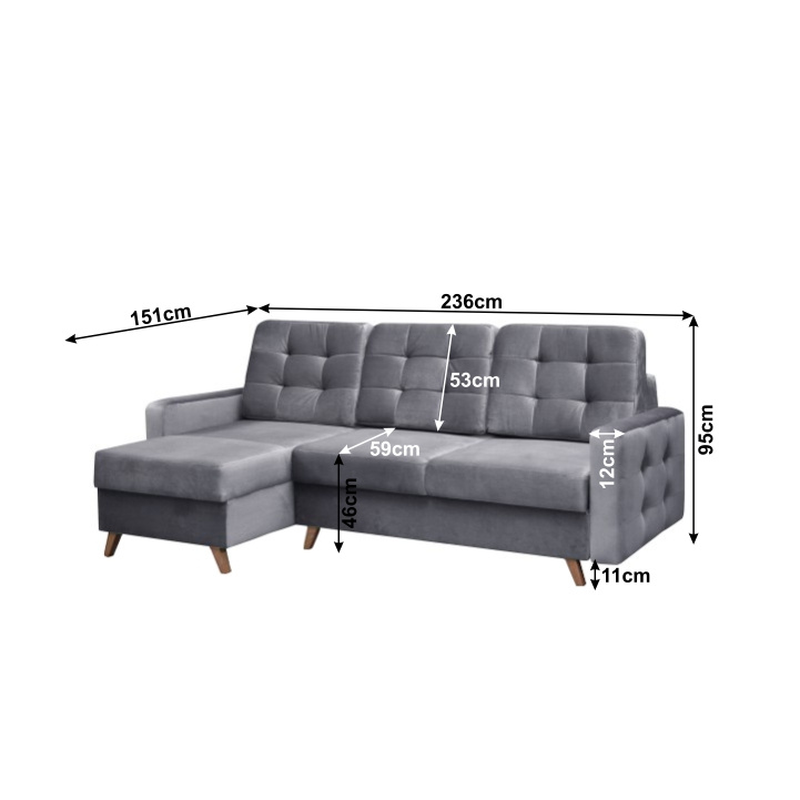 Rohová univerzální celočalouněná rozkládací sedací souprava s úložným prostorem MEDLIN Materiál: látka Kronos/ dřevo Barva: 22 šedá / wenge Rozměry (ŠxHxV): 236x151x95 cm Plocha na spaní (ŠxD): 146x206 cm Výška úložného prostoru od podlahy: 11 cm Výplň: pružina faliste / HR pěna Výška sedu: 46 cm Hloubka sedu: 59 cm Univerzální Dodávané v demontu.