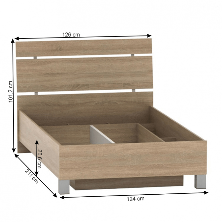 Postel LUNA s úložným prostorem Materiál: DTD laminovaná, ABS hrany po celém obvodu postele Barevné provedení: dub sonoma Rozměry: (ŠxHxV): 126x211x101,2 cm Plocha na spaní: 120x200 cm Bez roštu a matrace. Doporučujeme zakoupit matraci s rozměrem 120x200 cm z naší nabídky. Kvalitní slovenský výrobek Tloušťka materiálu: 16 mm Dodávané v demontu.
