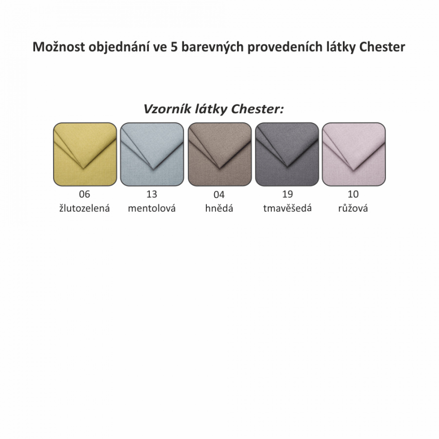Možnost objednání v 5 barevných provedeních látky Chester v ceně: pohovka 5.990 Kč, taburet 2.390 Kč. Upozorňujeme, že při objednávkách na nábytek v jiném barevném provedení, jak máme běžně skladem, neumíme zaručit doručení do Vánoc. Totéž platí i při nábytku označeném na objednávku. Upozorňujeme, že při objednávkách na nábytek v jiném barevném provedení, jak máme běžně skladem, neumíme zaručit doručení do Vánoc. Totéž platí i při nábytku označeném na objednávku. Doba dodání 14-17 týdnů.