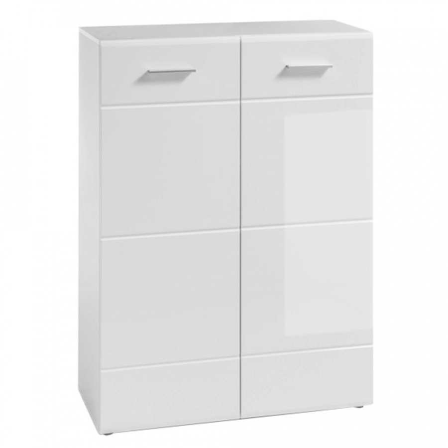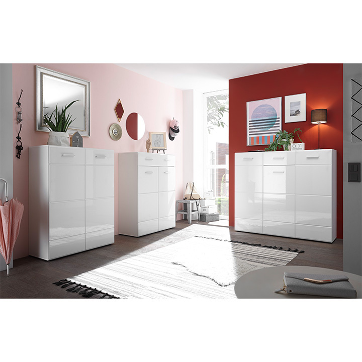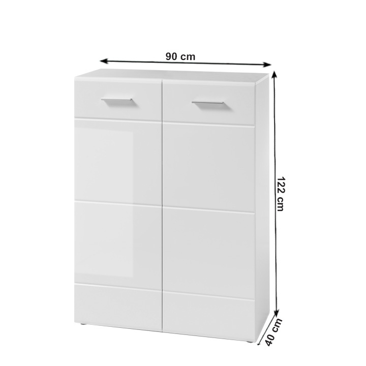 Botník NORLAN 1 Materiál: DTD fóliovaná / MDF frézovaná Barva: bílá / bílý extra vysoký lesk HG Rozměry (ŠxHxV): 90x40x122 cm 2-dveřový botník 5-vnitřních polic Dodávané v demontu.