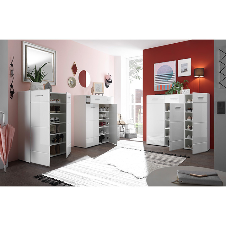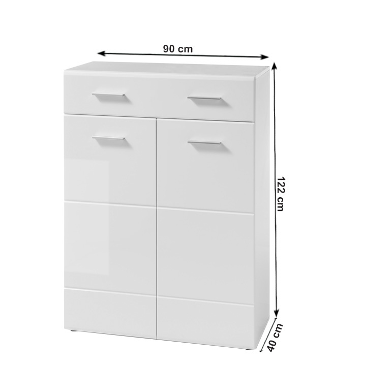 Materiál: DTD laminovaná / MDF frézovaná Barva: bílá / bílá s extra vysokým leskem HG Rozměry (ŠxHxV): 90x40x122 cm 2-dveřový botník 4-vnitřních polic 1 šuplík Dodávané v demontu