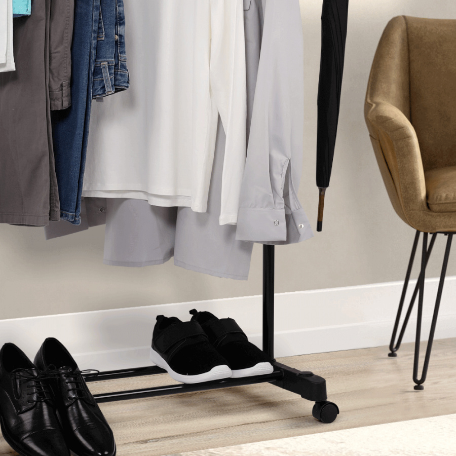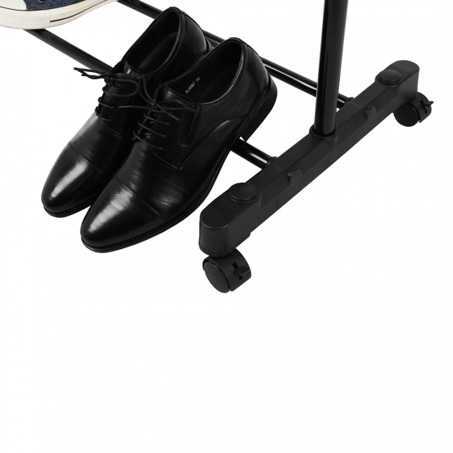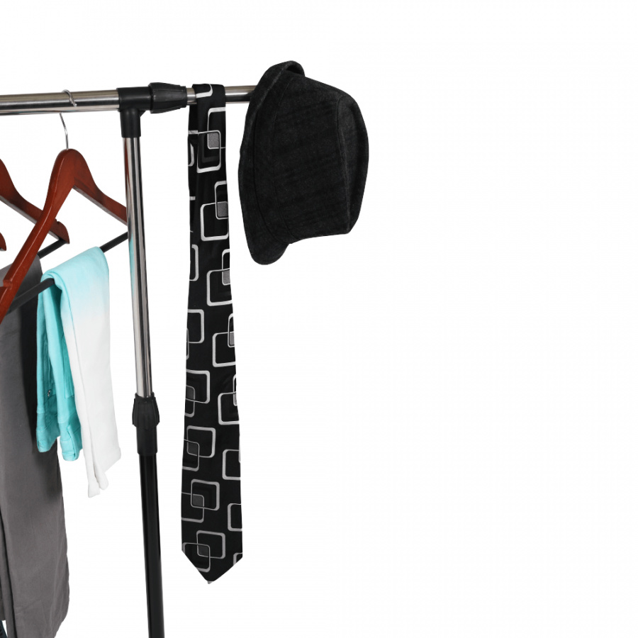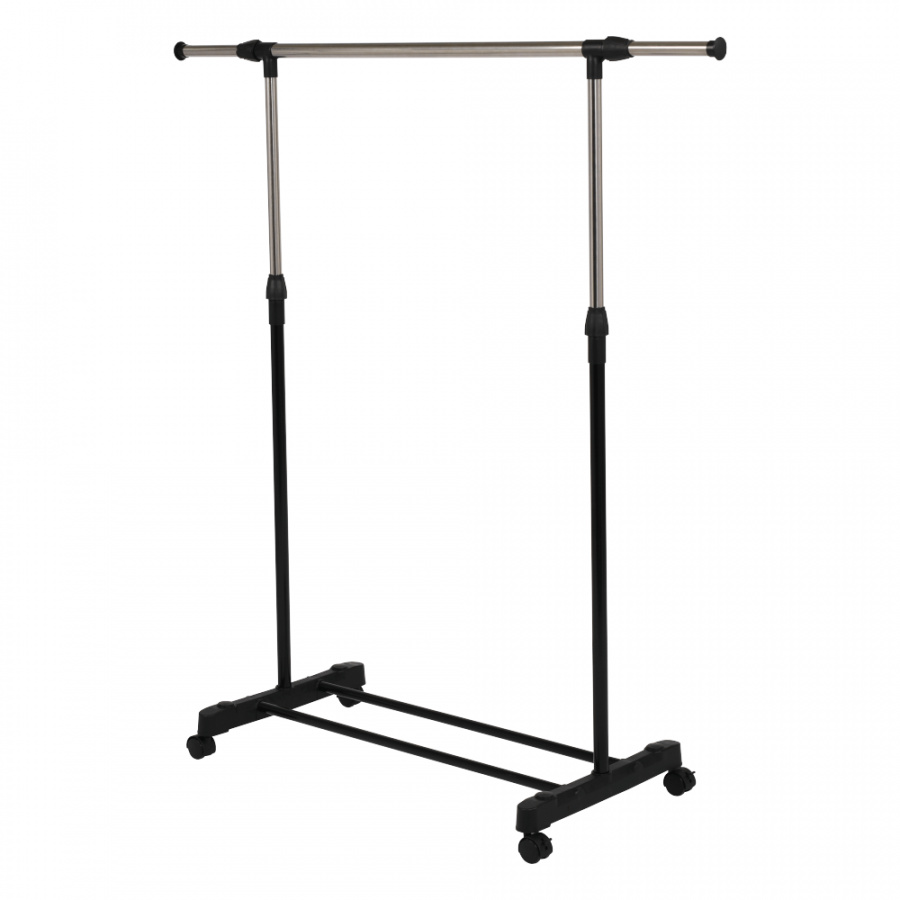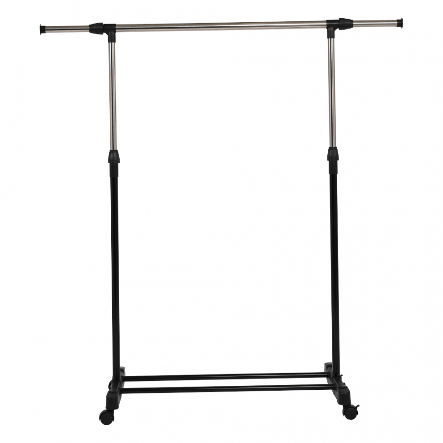 Pojízdný věšák s kolečky a jednou závěsnou výškově nastavitelnou tyčí Materiál: kov / plast Barva: černá Rozměry (ŠxHxV): 80x43x85-150 cm Hmotnost: 1,6 kg Dodávané v demontu.