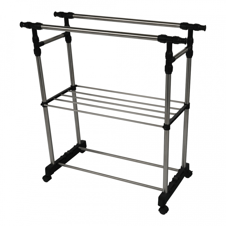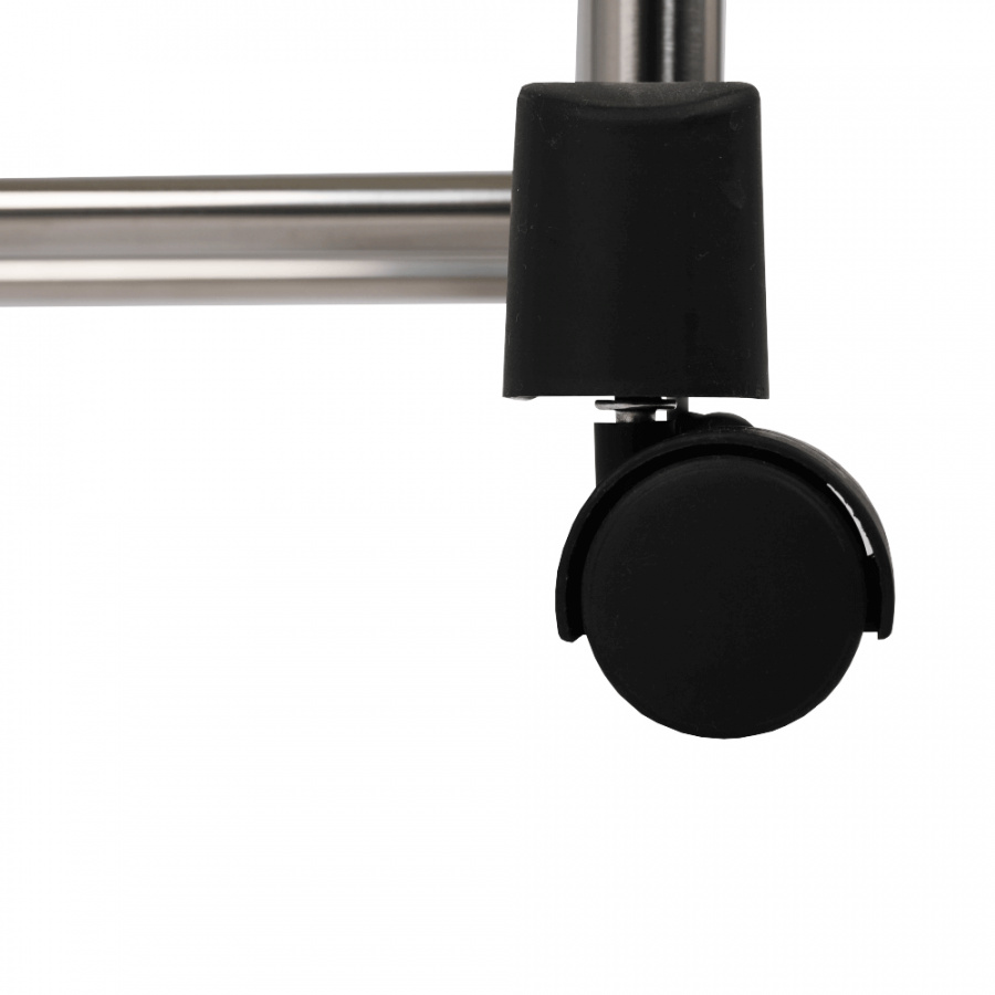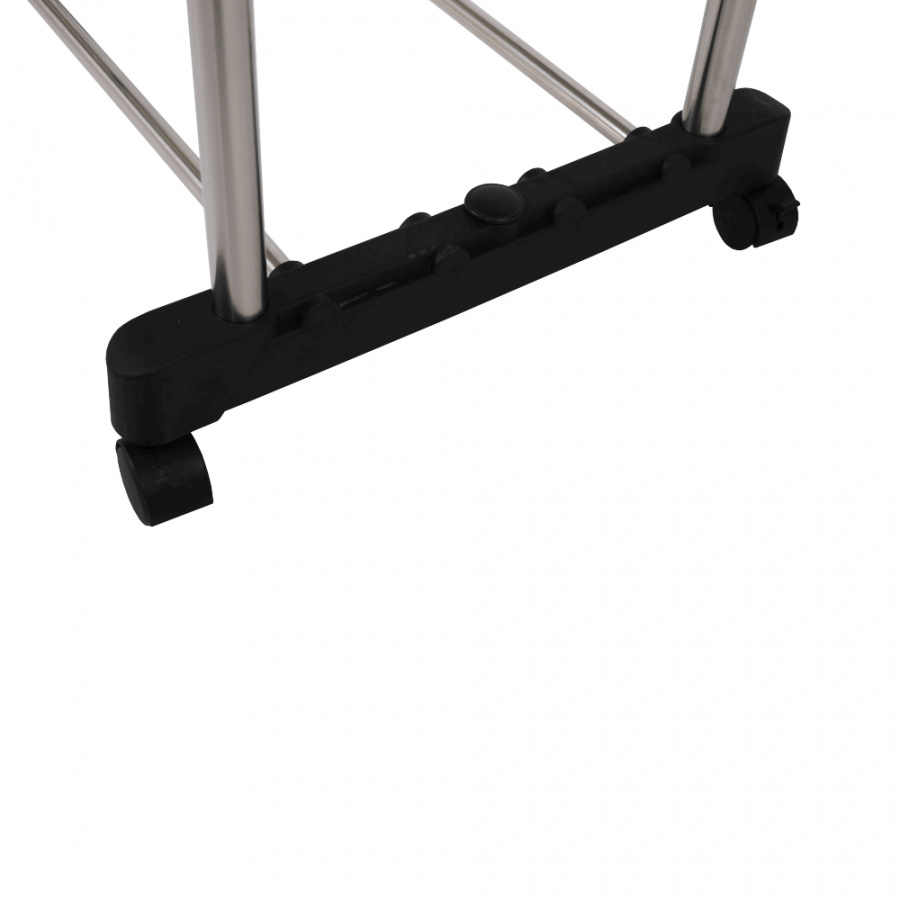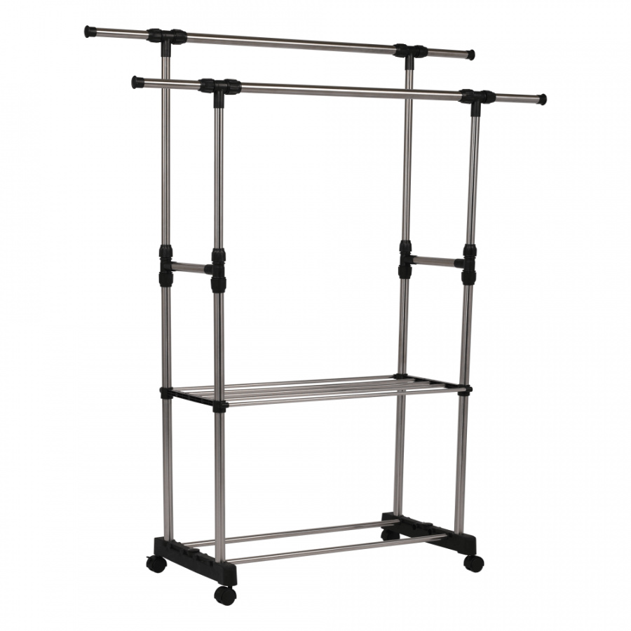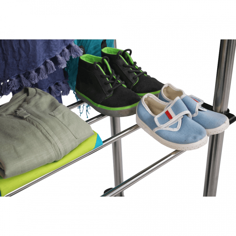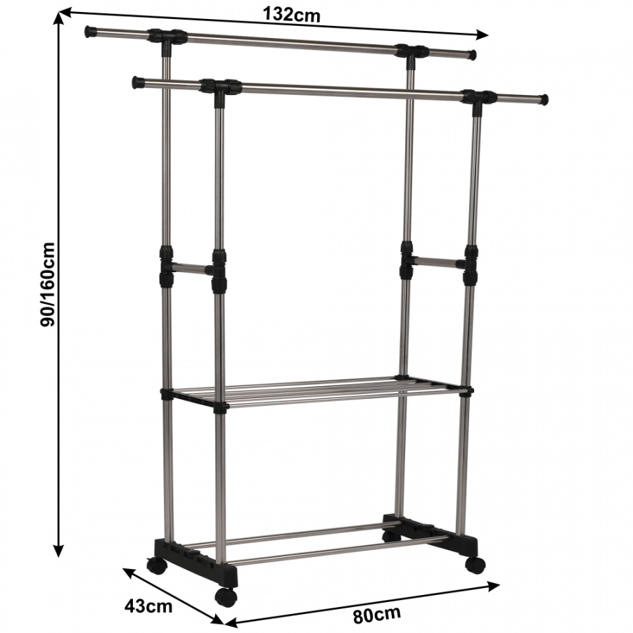 pojízdný věšák s kolečky a dvěma závěsnými výškově nastavitelnými tyčemi a odkládací poličkou, provedení: nerezový kov + černý plast, rozměry ŠxHxV: 80x43x90-160 cm.