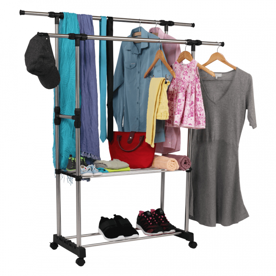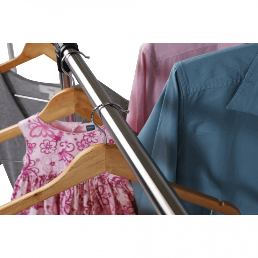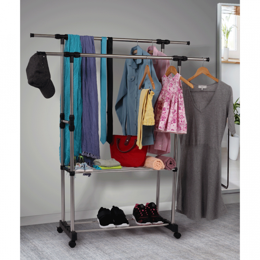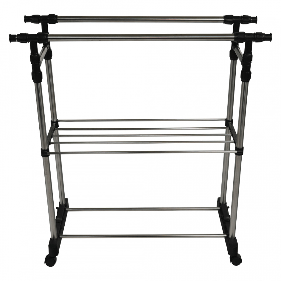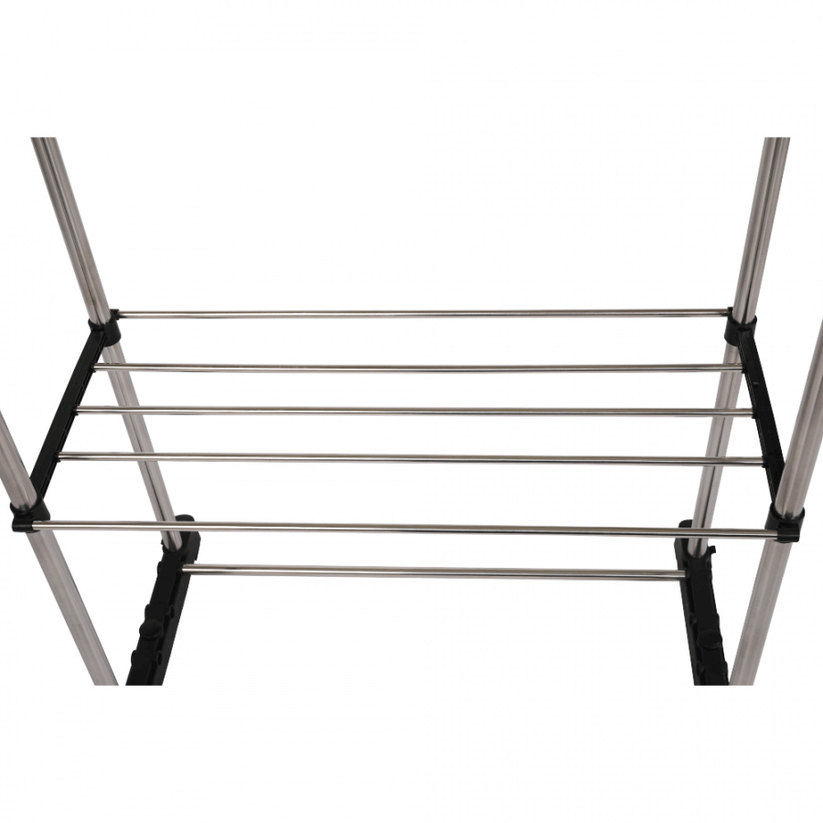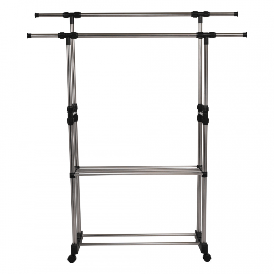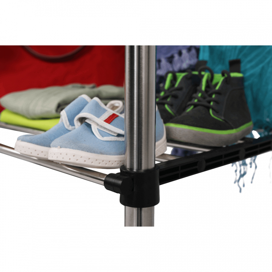 pojízdný věšák s kolečky a dvěma závěsnými výškově nastavitelnými tyčemi a odkládací poličkou, provedení: nerezový kov + černý plast, rozměry ŠxHxV: 80x43x90-160 cm.